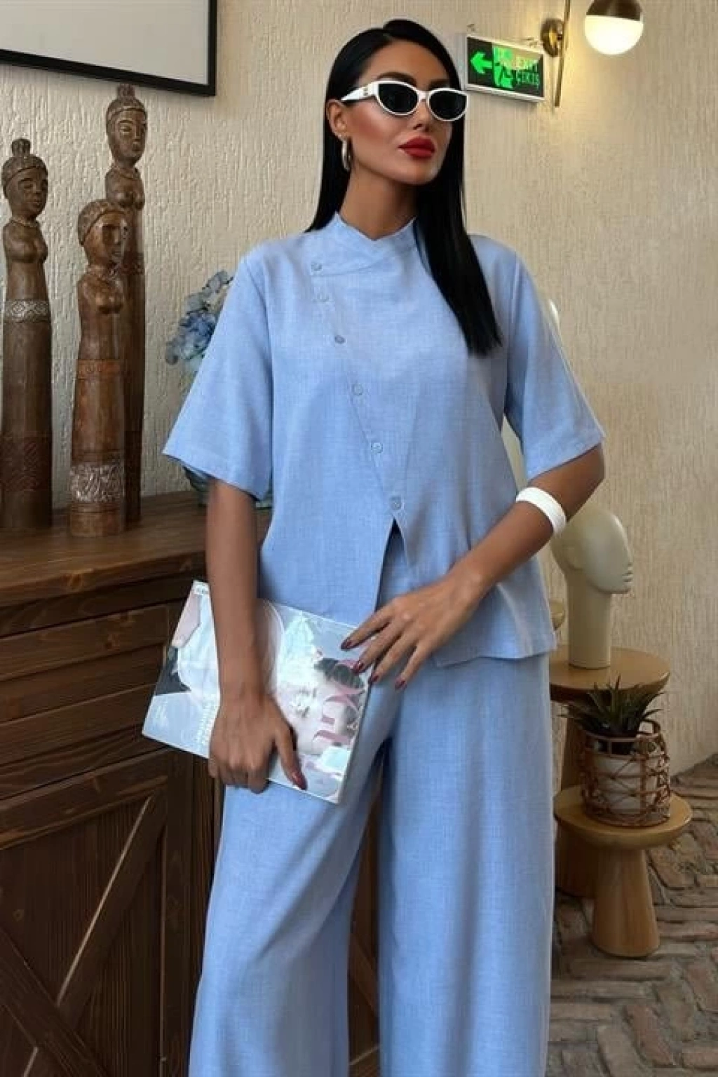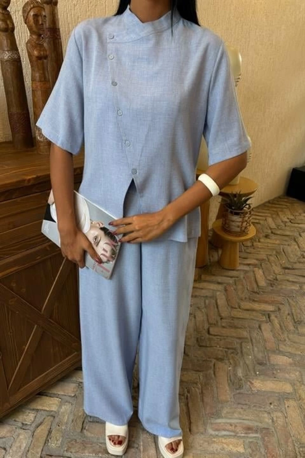 Hakim Yaka Çapraz Düğmeli Plazzo Pantolon Viscon Keten Takım 10091