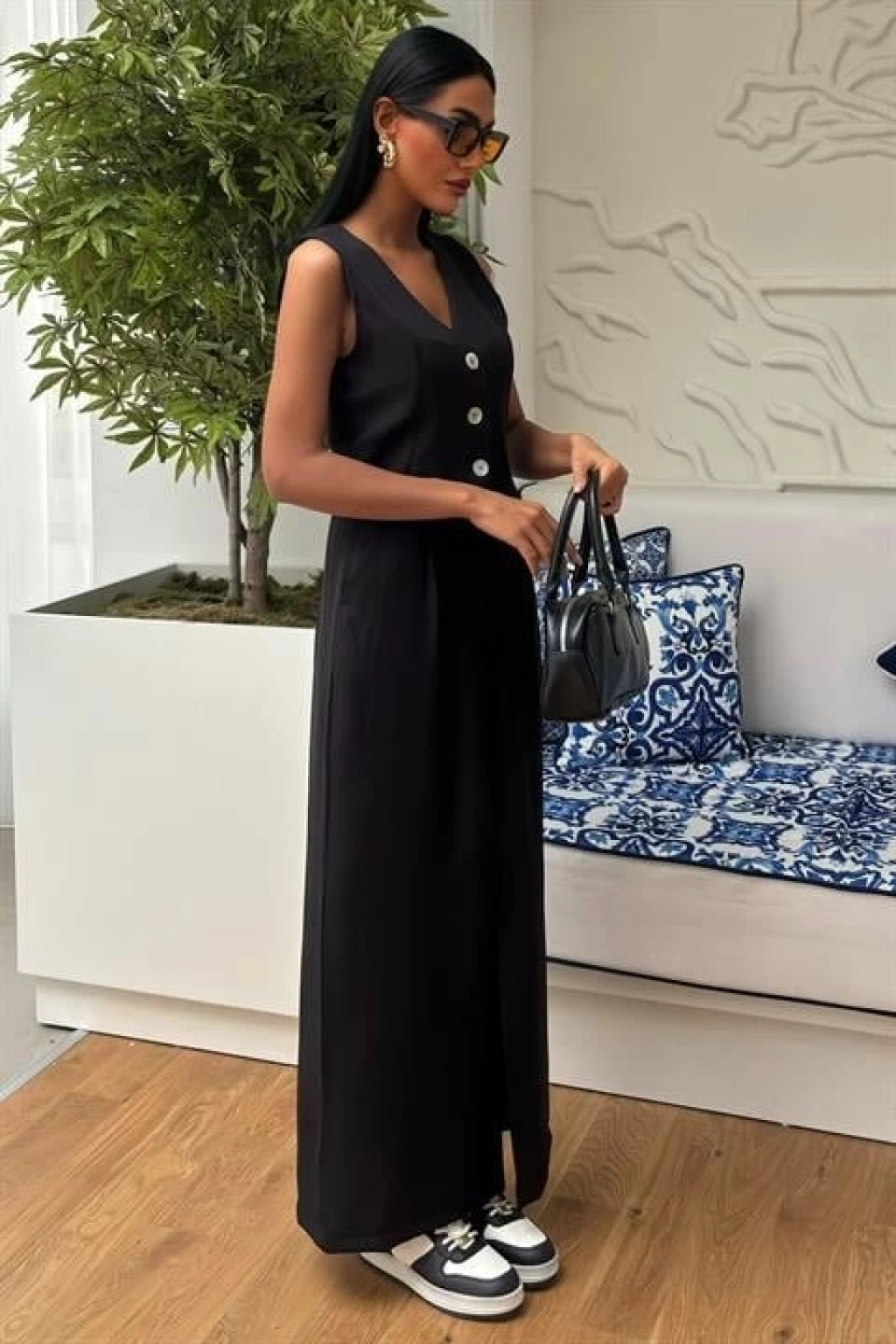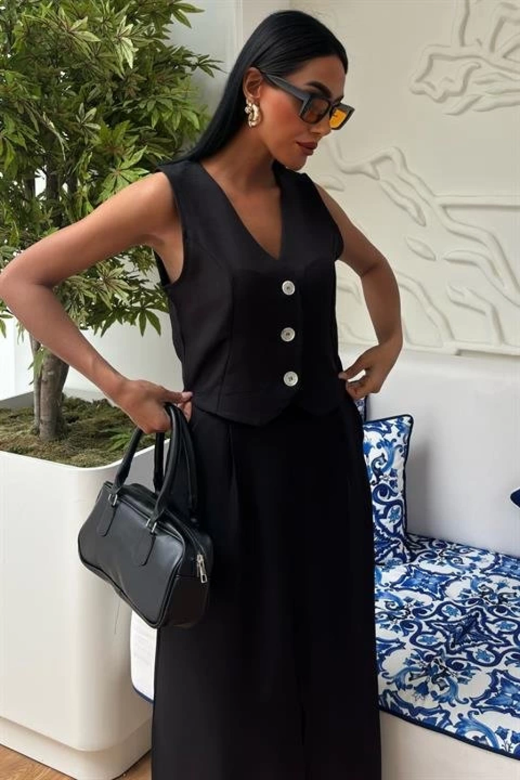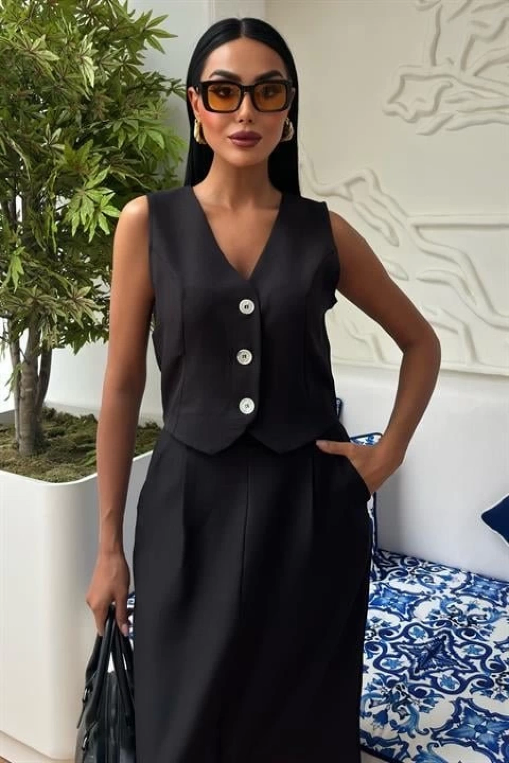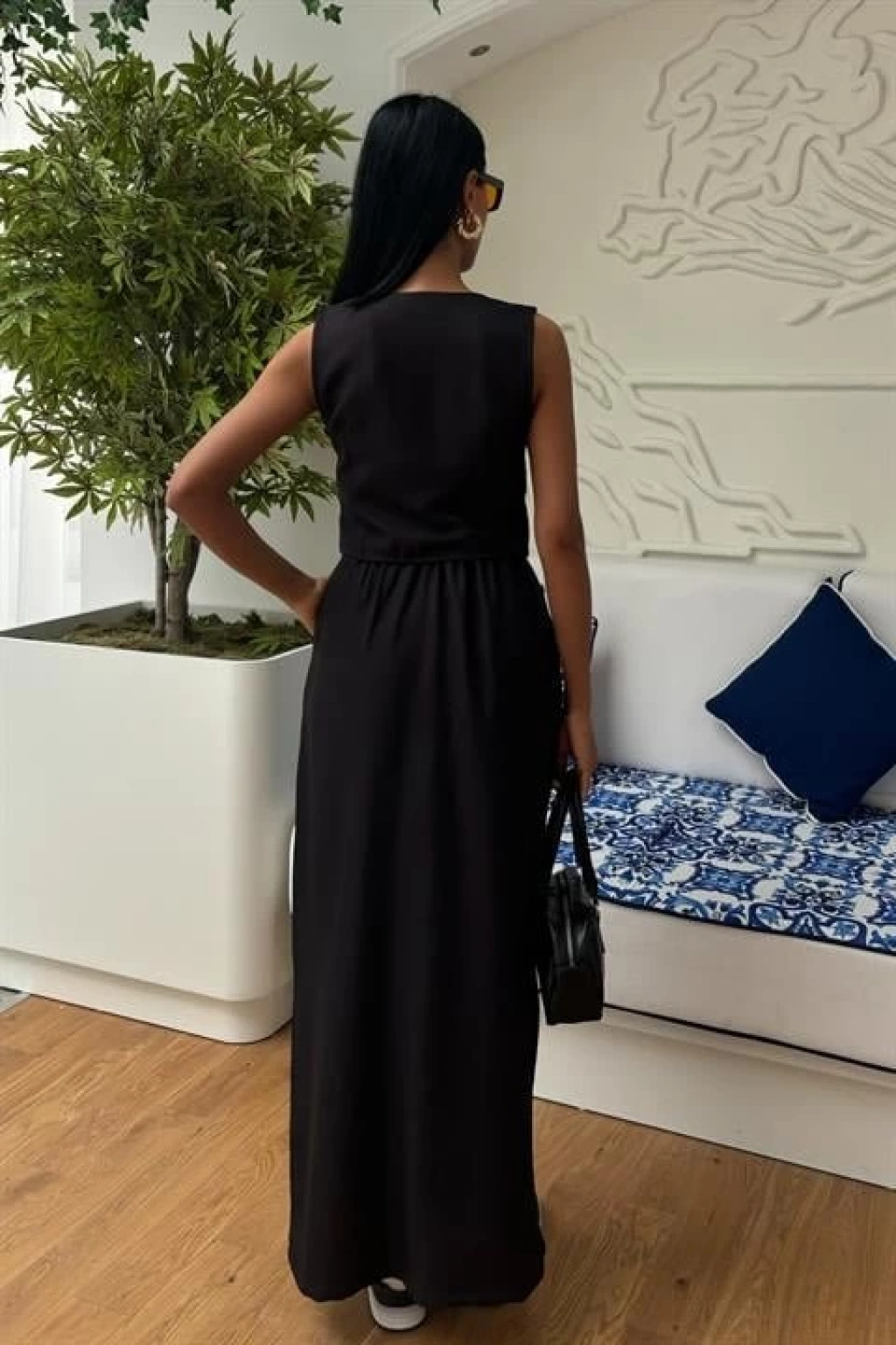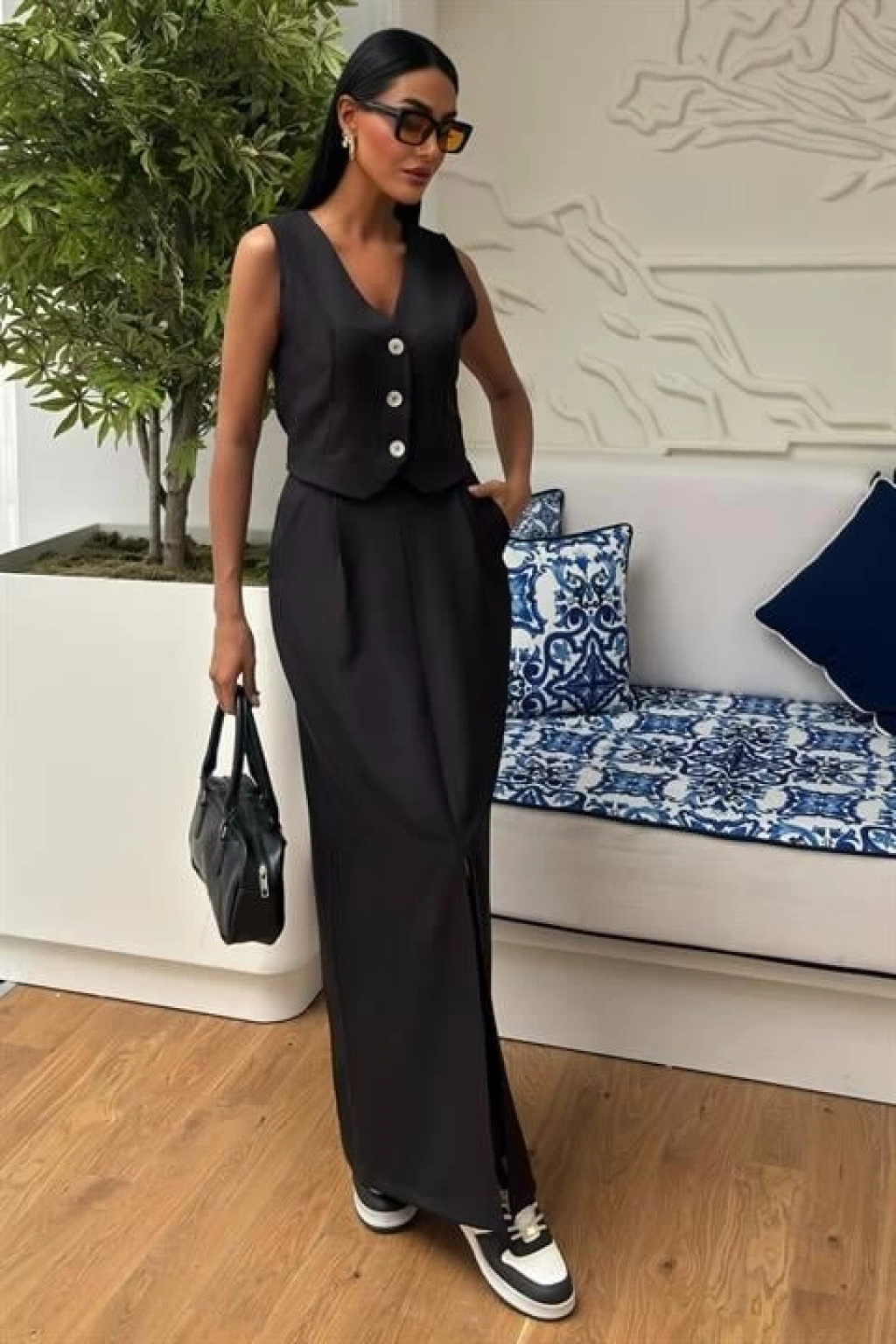 Etek Yırtmaçlı Yelekli Keten Takım 10131