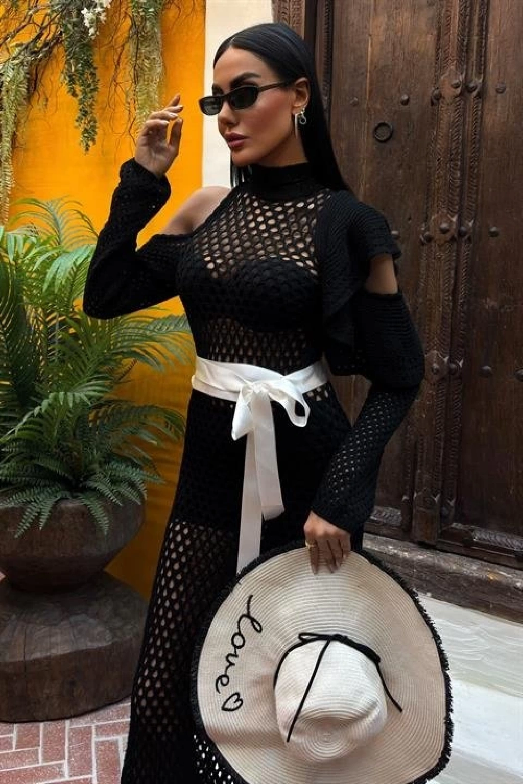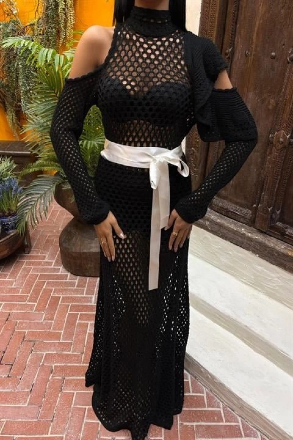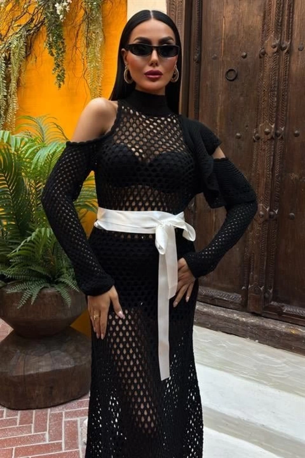 Saten Kuşaklı Ajurlu Triko Elbise 2847