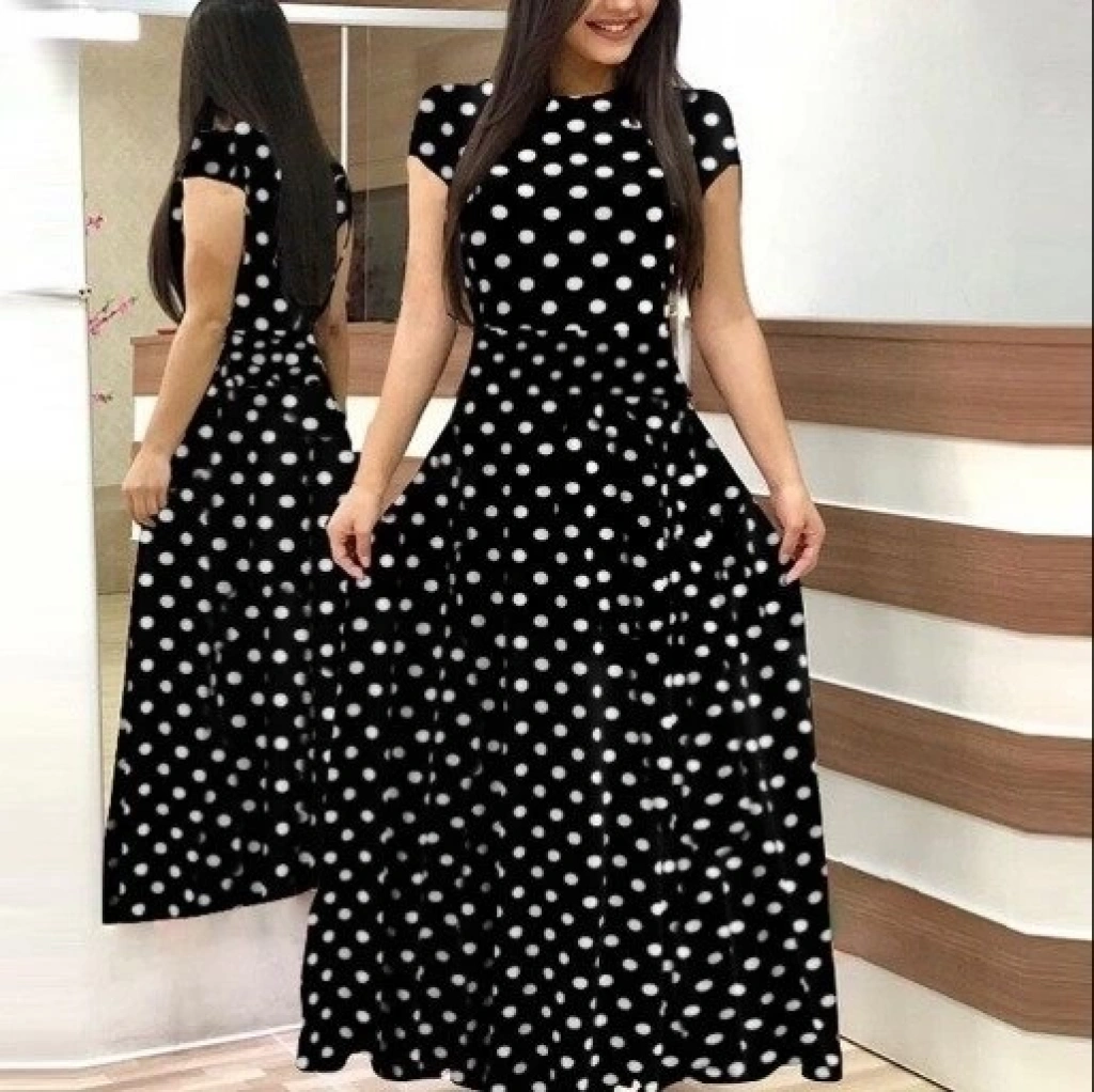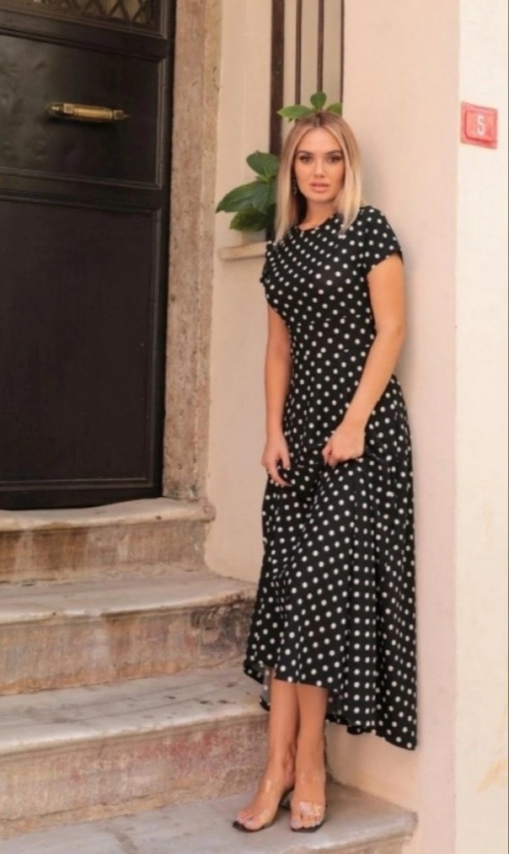 Kadın Kısa Kollu Bisiklet Yaka Puantiyeli Maksi örme Krep Elbise