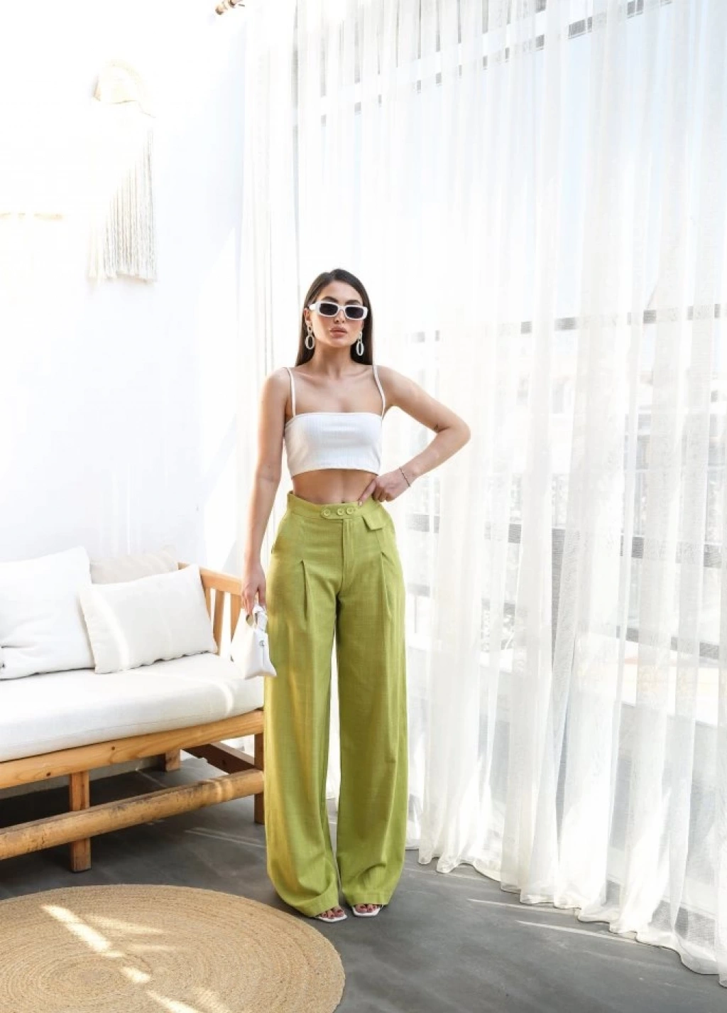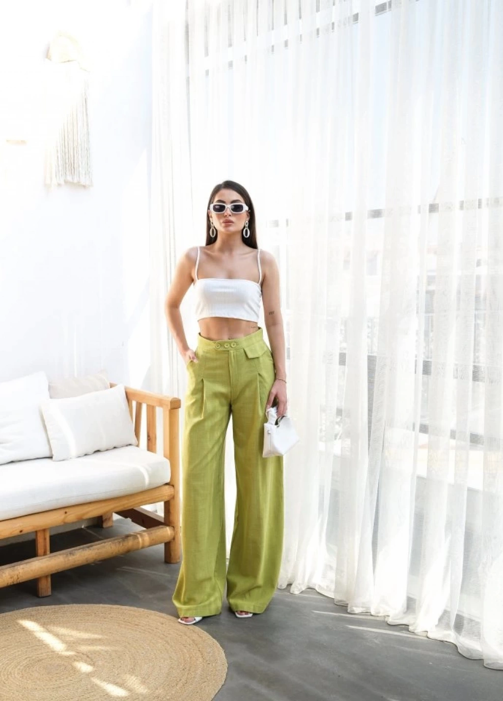 Keten Düğme Detayli Dökümlü Palazzo Pantolon