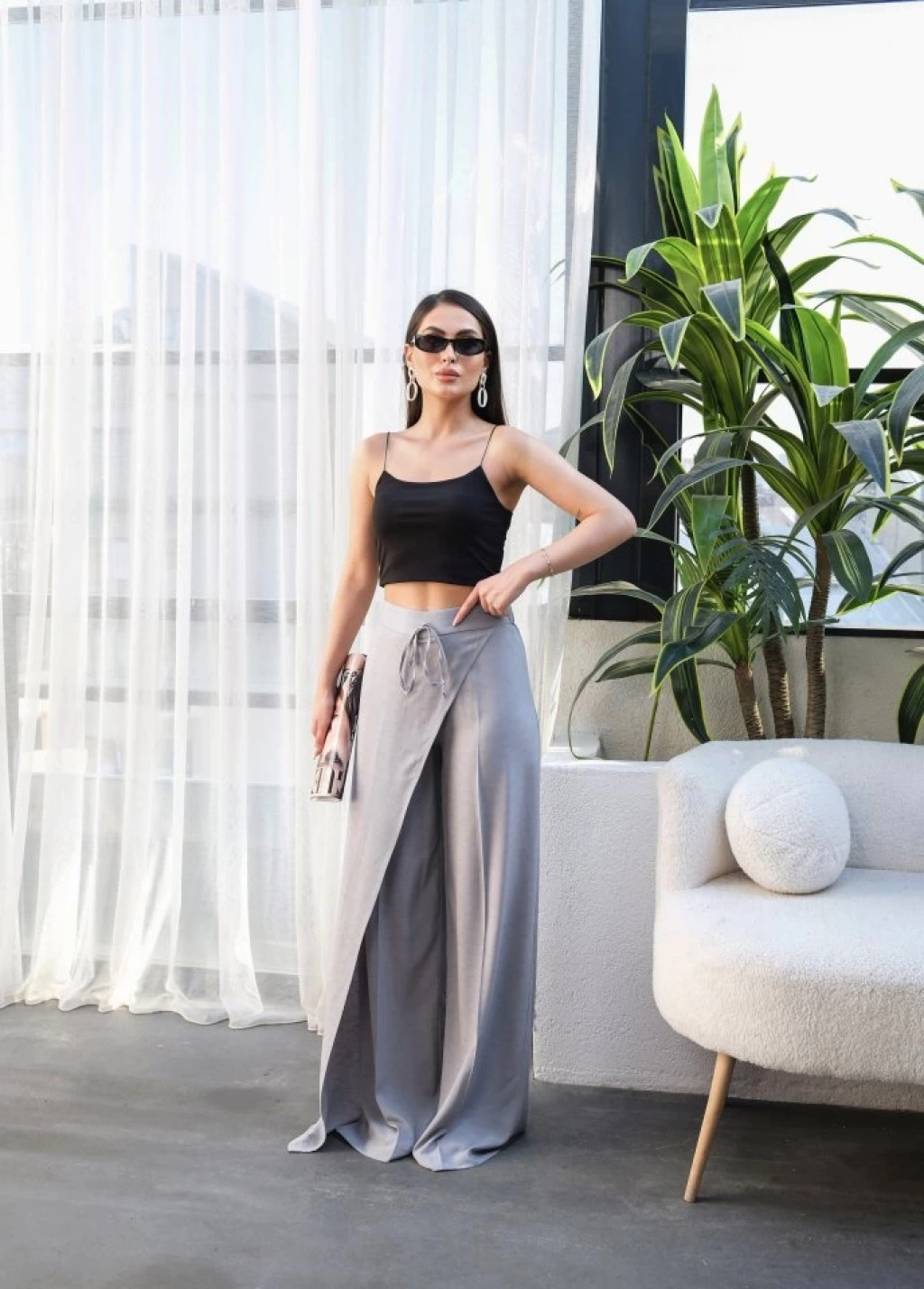 Keten Önü Çapraz Parçali Lasti̇kli̇ Ve Bağcikli Geni̇ş Paça Pantolon