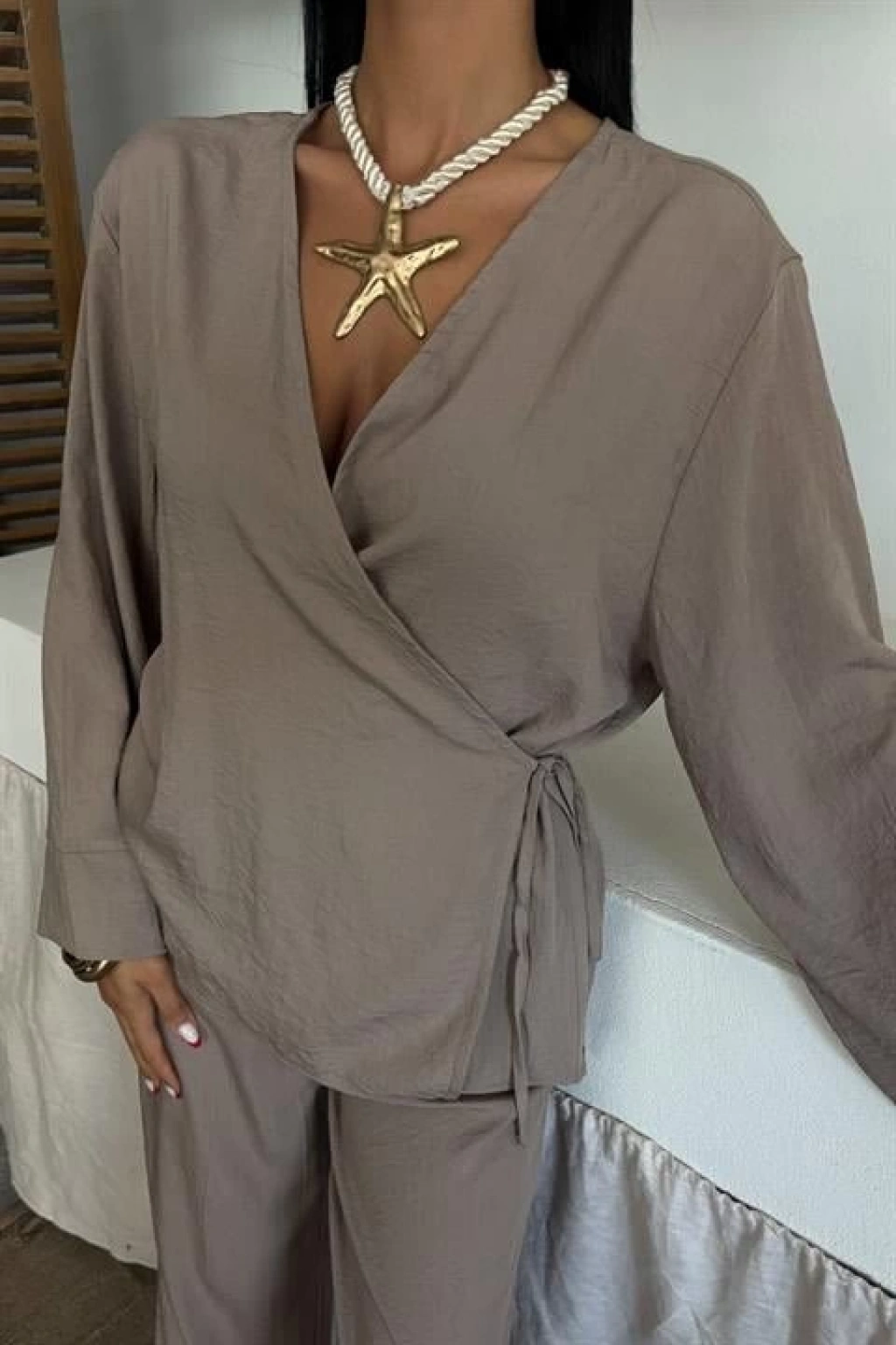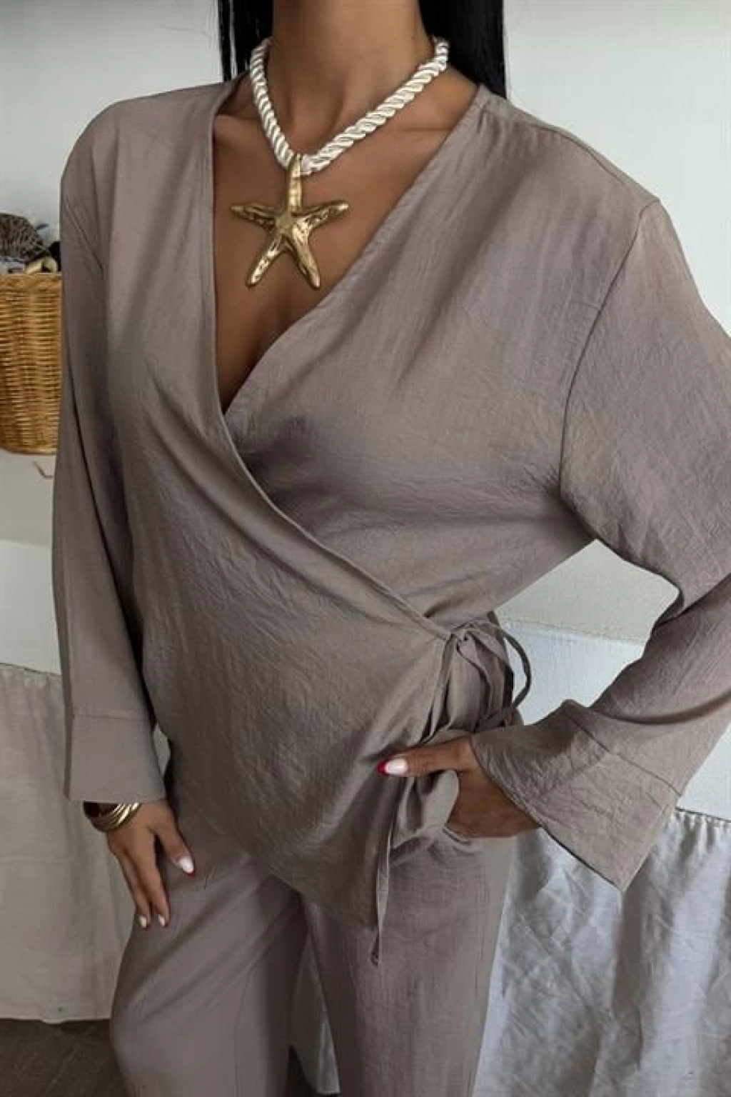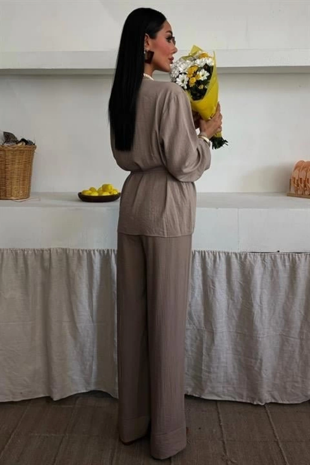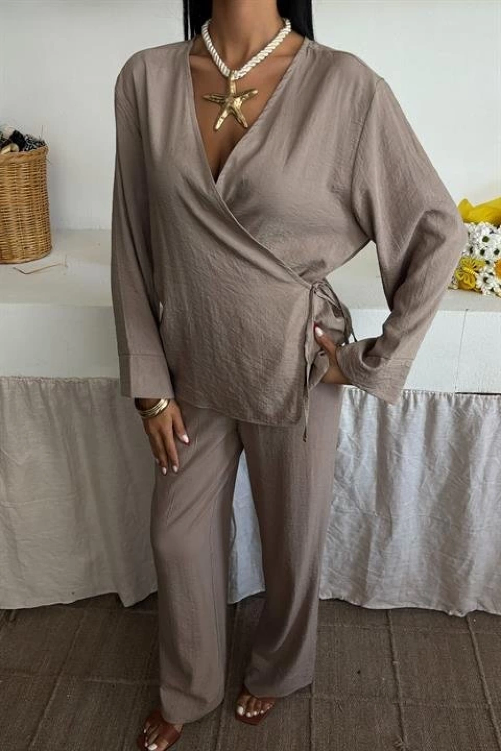 Kruvaze Model Klasik Pantolonlu Çupra Keten Takım 10191