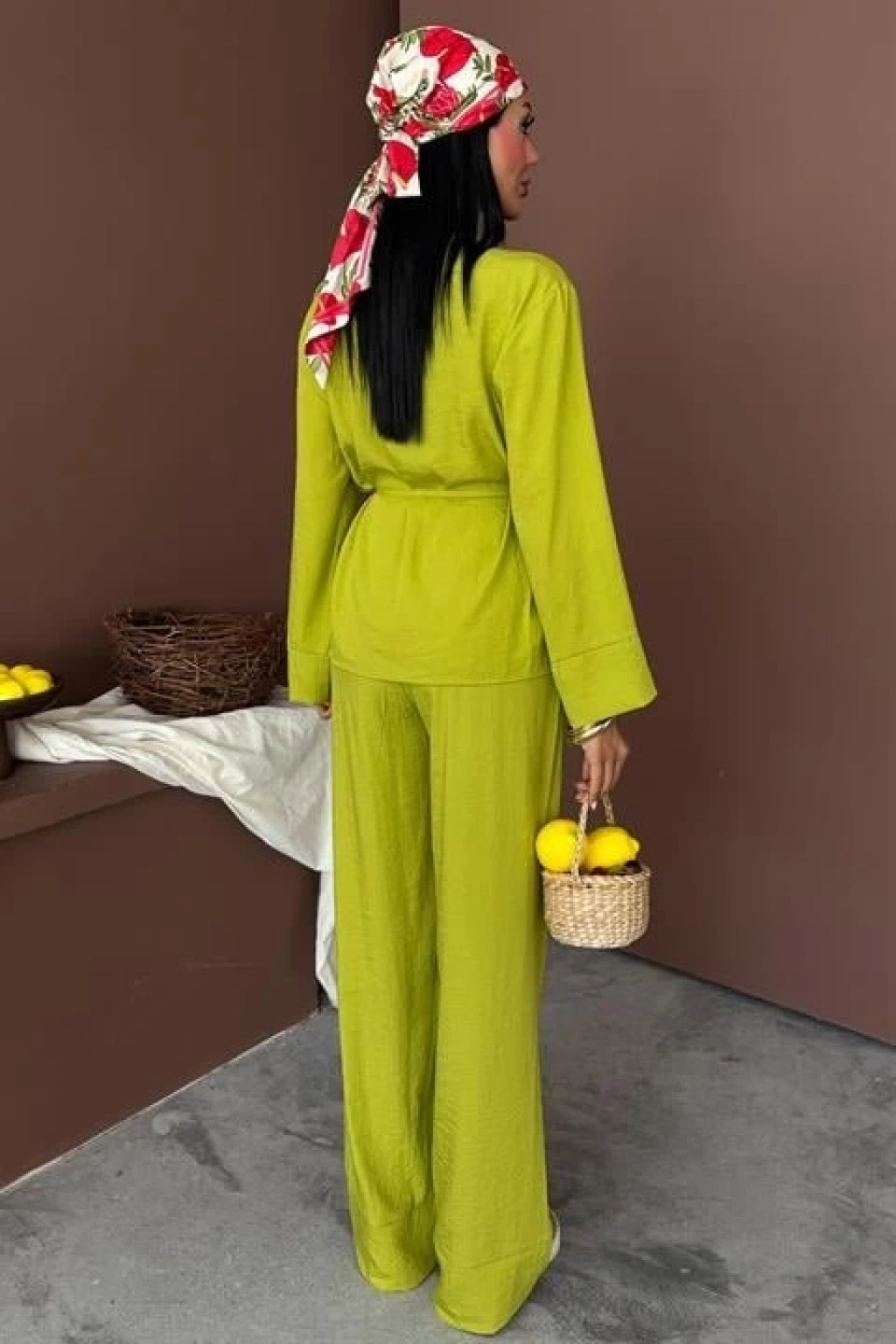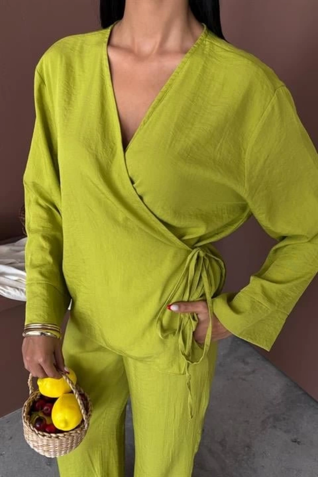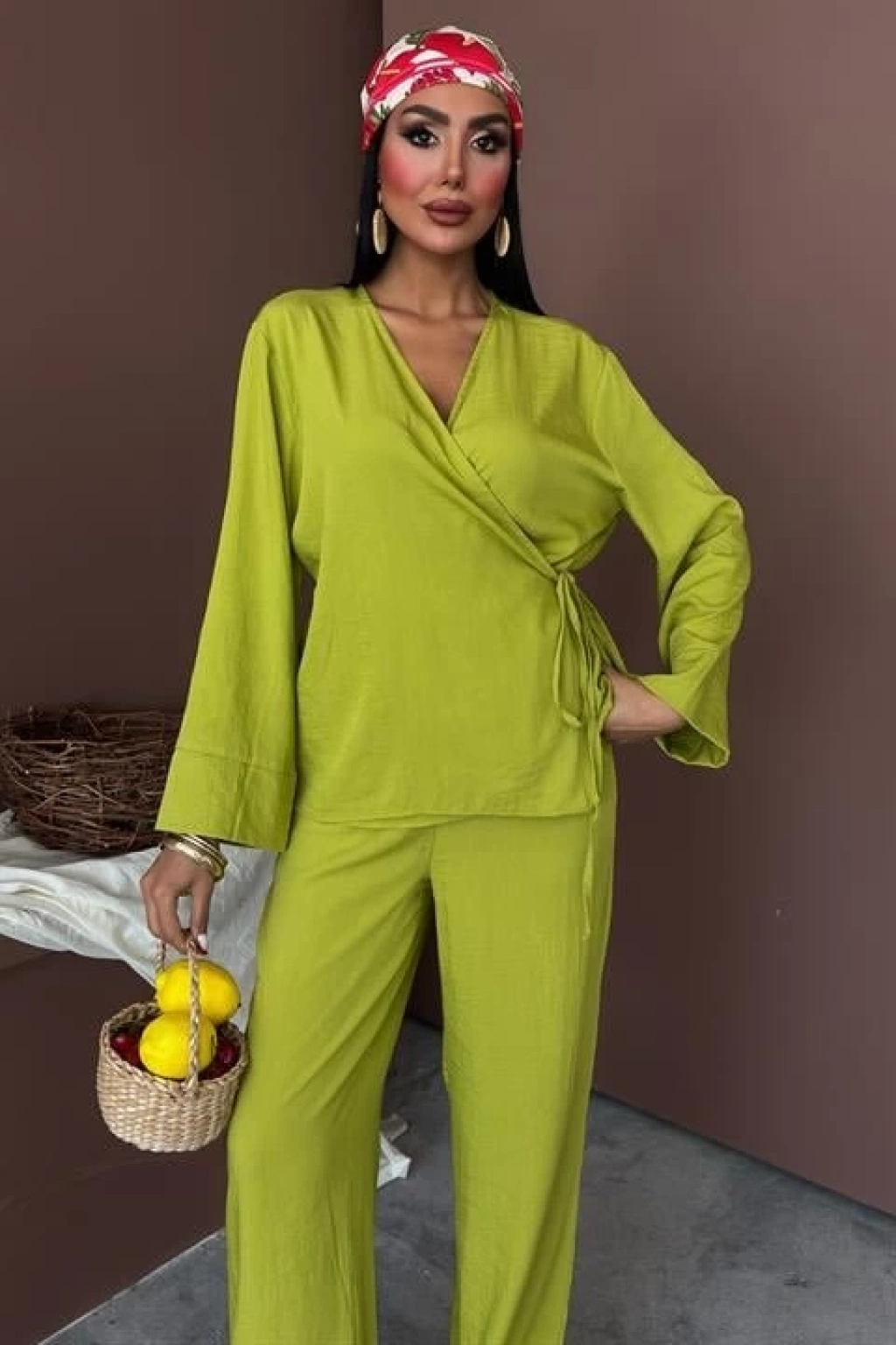 Kruvaze Model Klasik Pantolonlu Çupra Keten Takım 10191