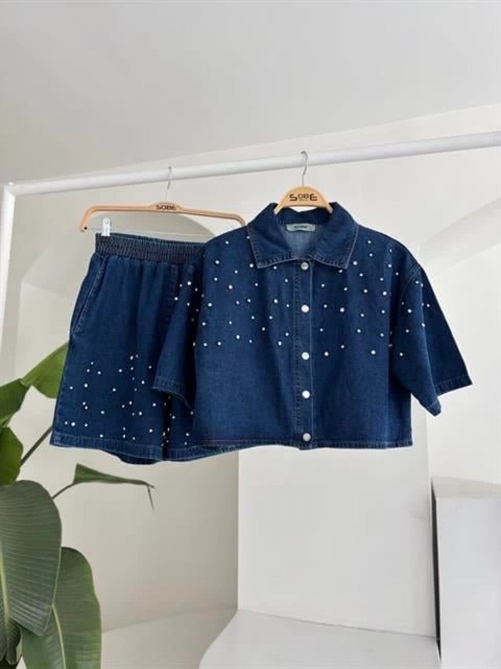 Taş Detaylı Gömlek Şort Denim Takım 10175