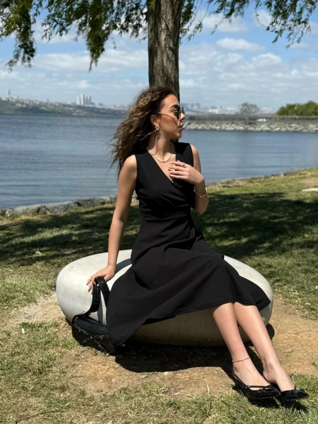 Kadın Ithal Krep Kumaş Kruvaze Yaka Eteği Kloş Kolsuz Mini Elbise