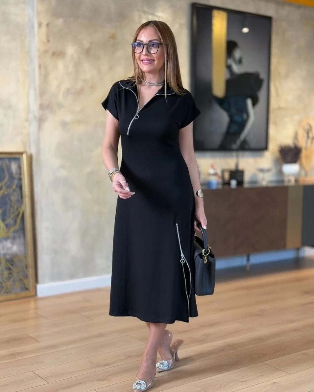Kadın Kısa Kollu Yakadan Ve Etekten Fermuarlı Midi Viskon Iki Iplik Elbise