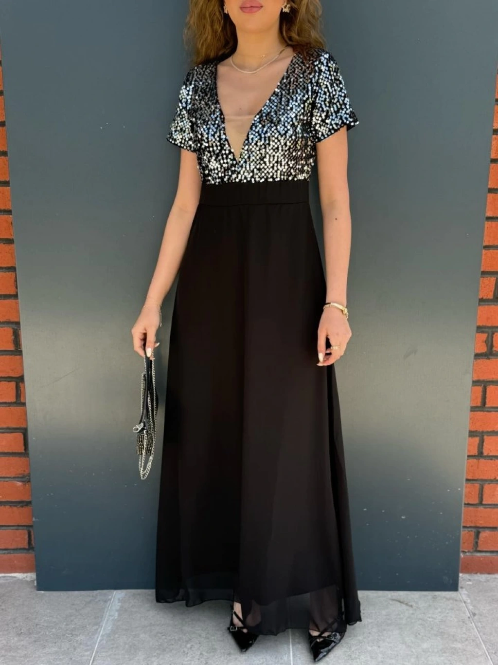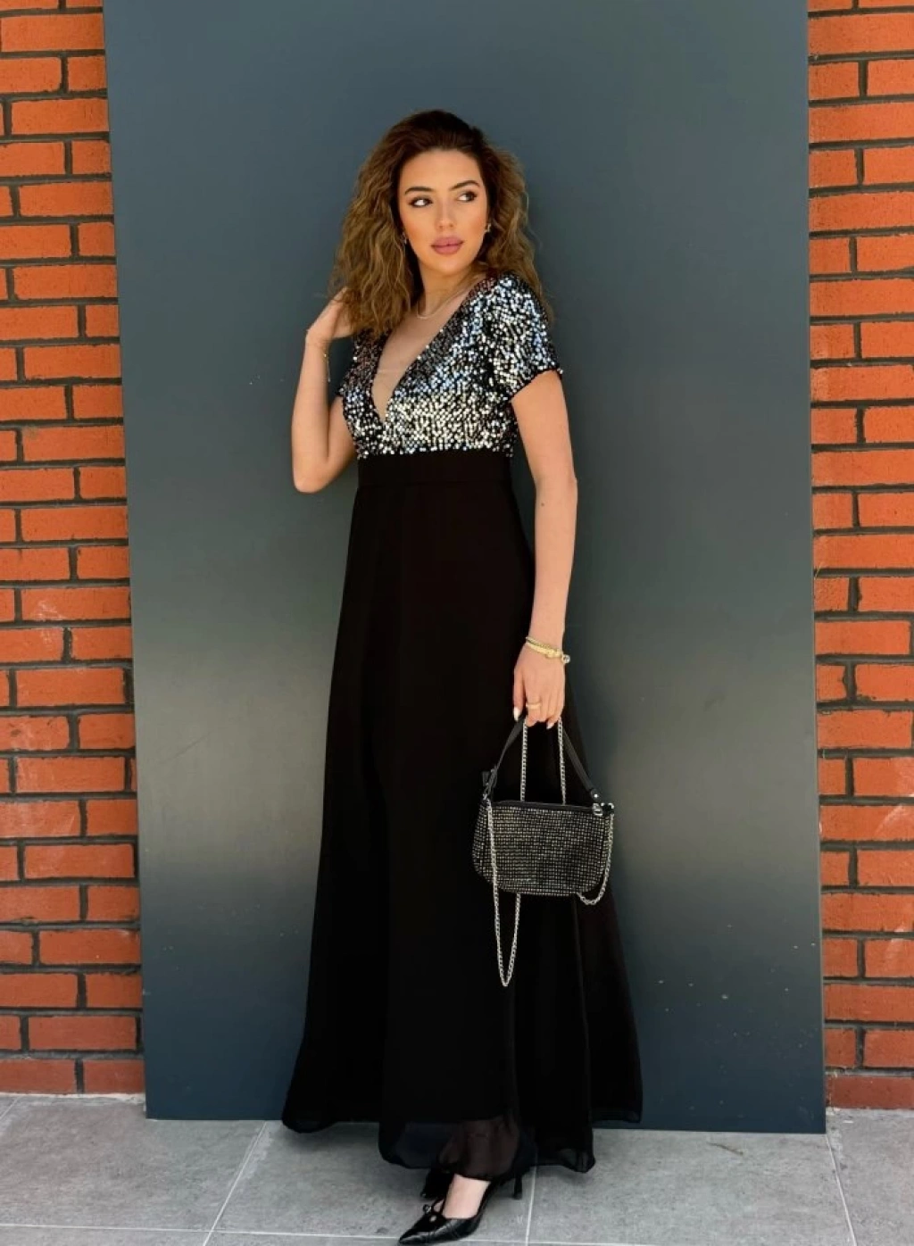 Kadın Kısa Kollu Derin V Yakalı A Kesim Pulpayet Detaylı şifon Nedime Elbisesi