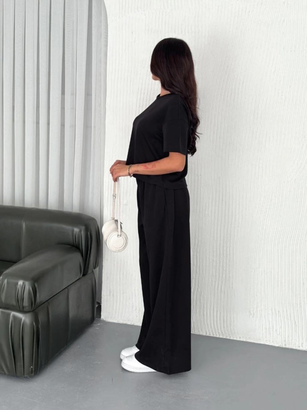 Osy Modal Yumuşak Dokulu Kumaş Bisiklet Yaka T-shirt Bol Paça Pantalon Ikili Takım -Siyah