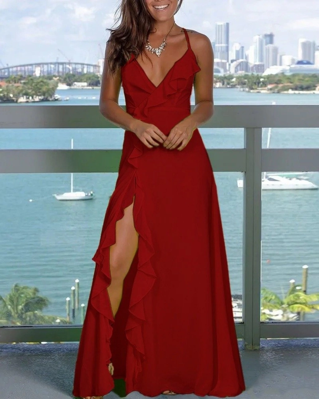 Kadın Ip Askılı Dekolteli Yırtmaç Detay Krep Elbise