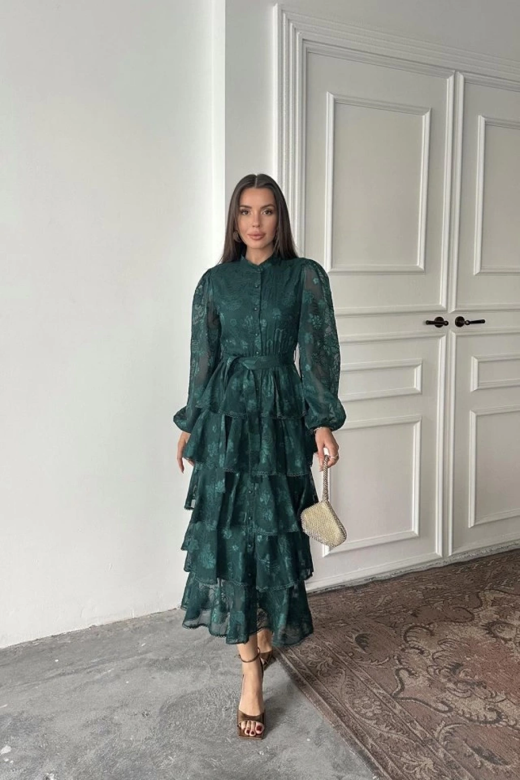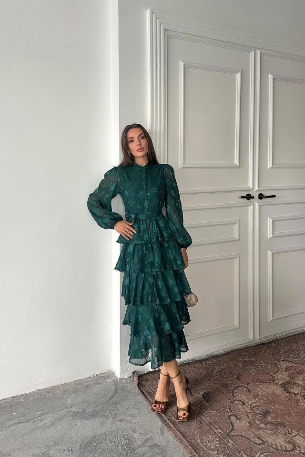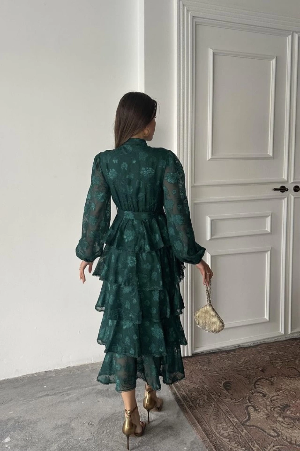 Zümrüt Valonlu Şeritli Kat Kat Elbise