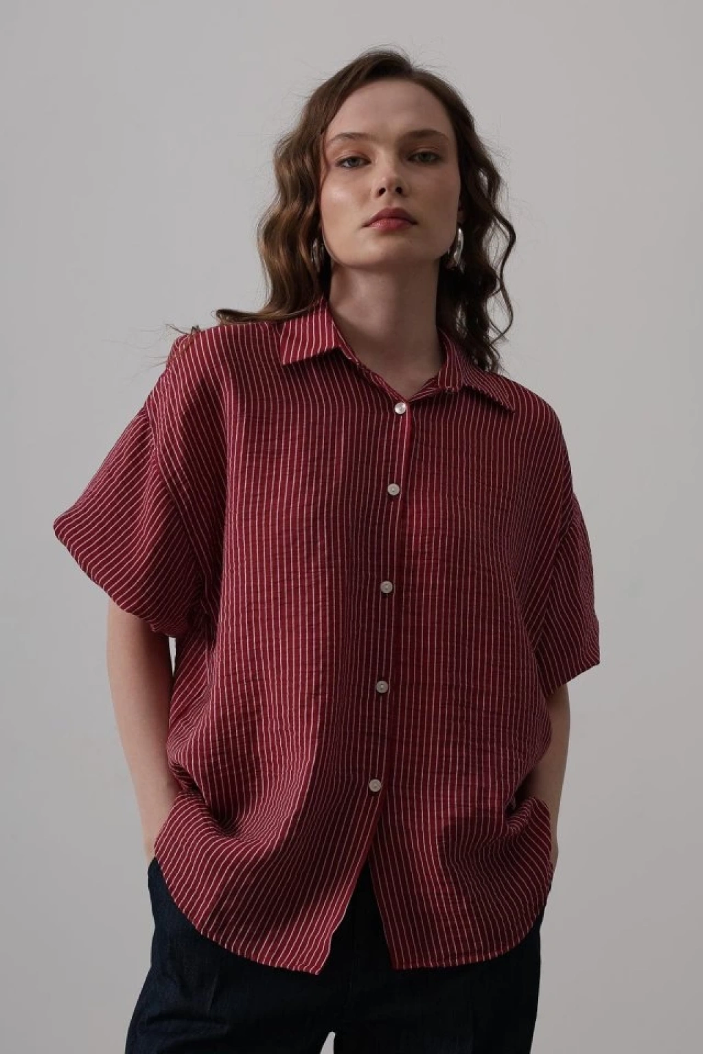 Yarım Balon Kol Çizgili Gömlek - Bordo