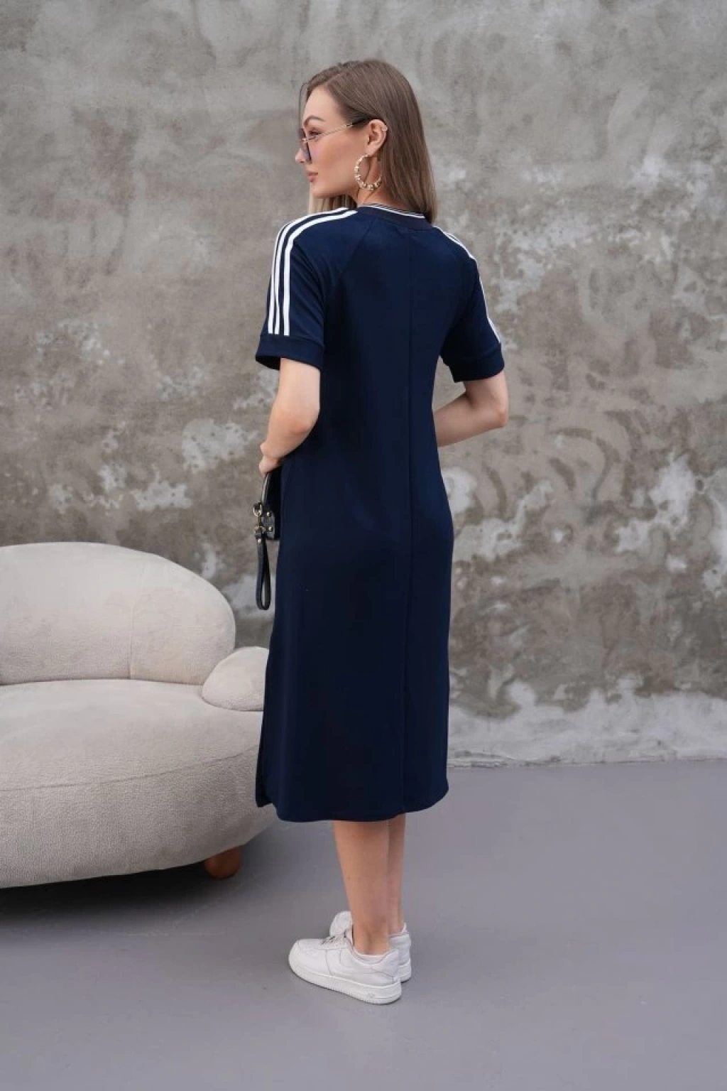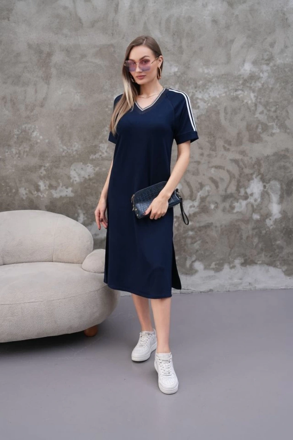 Kadın Kristal Kumaş şerit Ve Yırtmaç Detaylı V Yaka Midi Boy Elbise