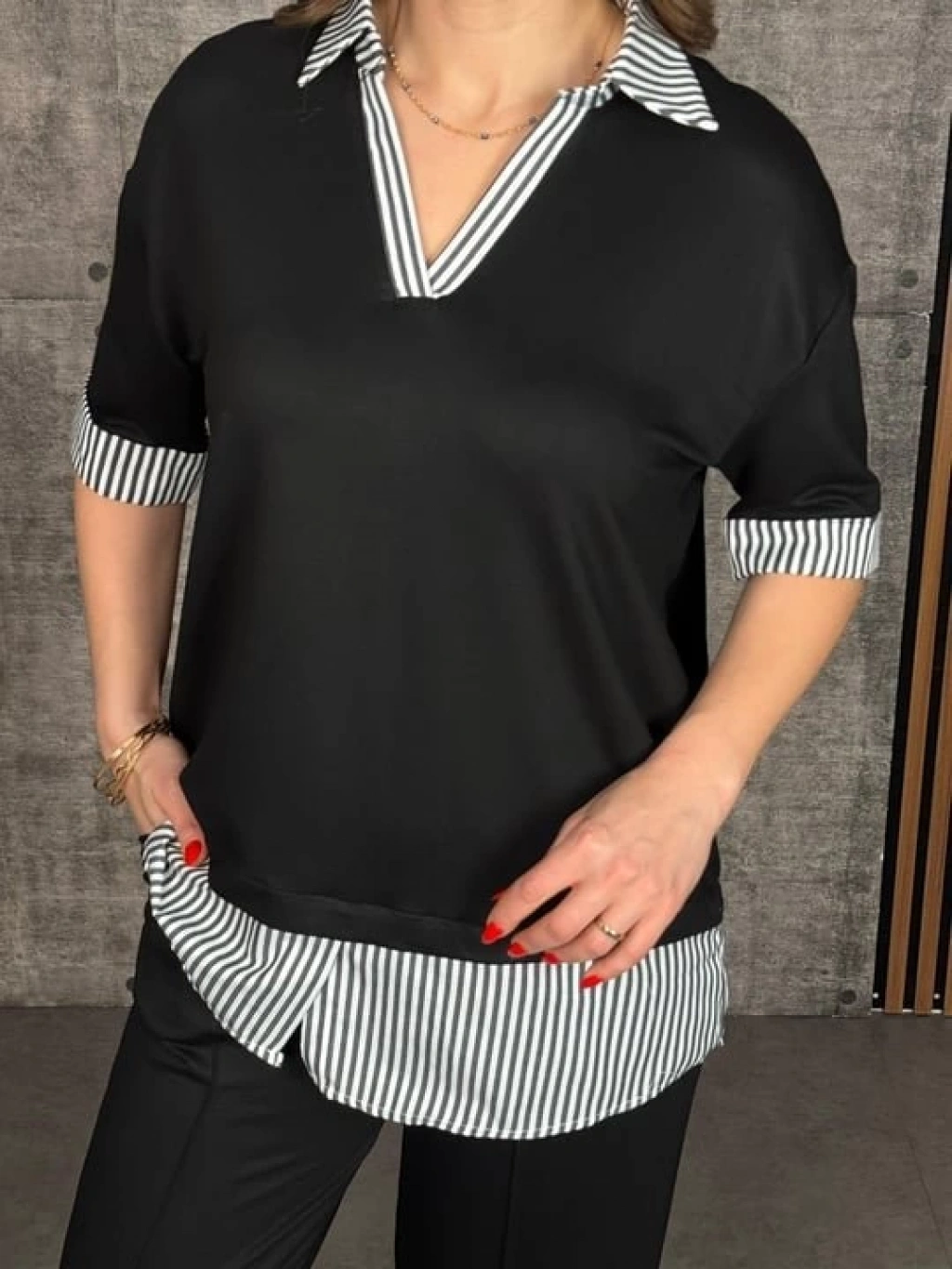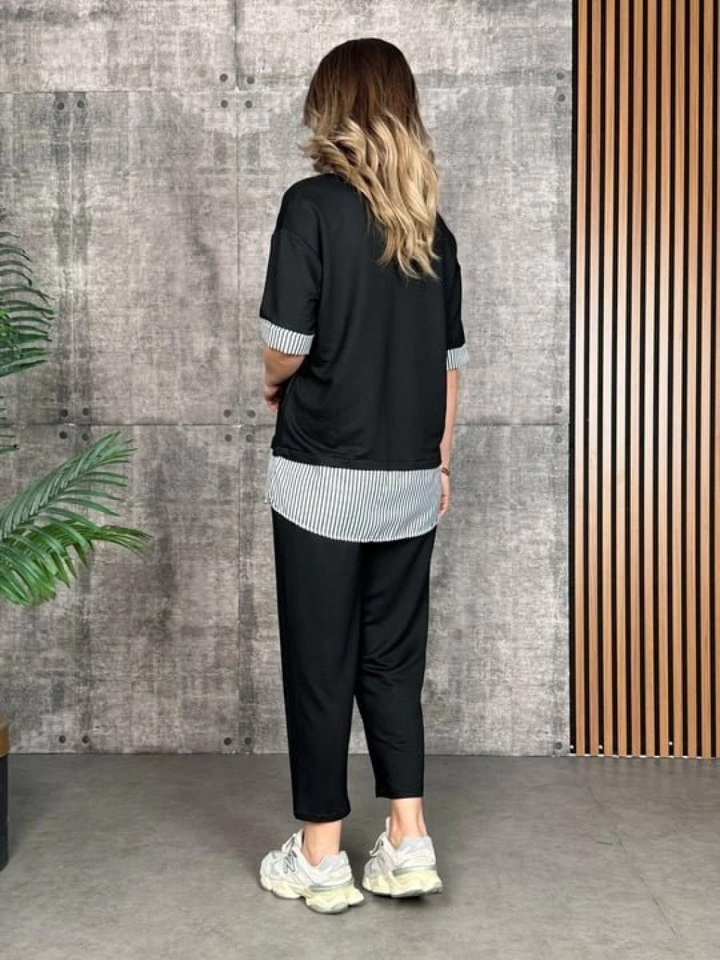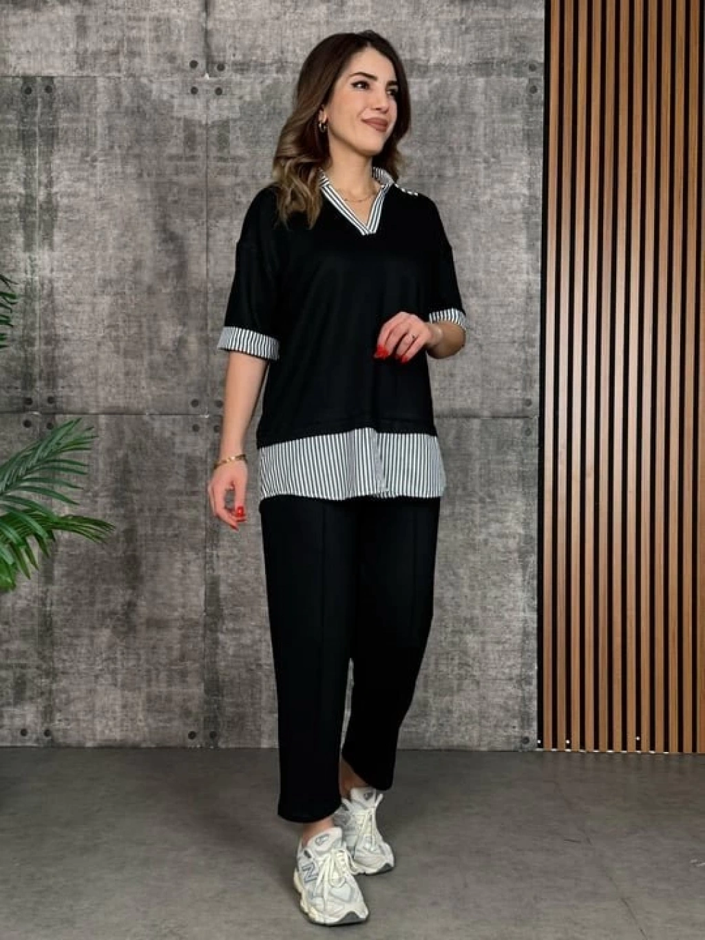 Kadın Modal Kumaş çizgili Gömlek Yaka Ikili Takım