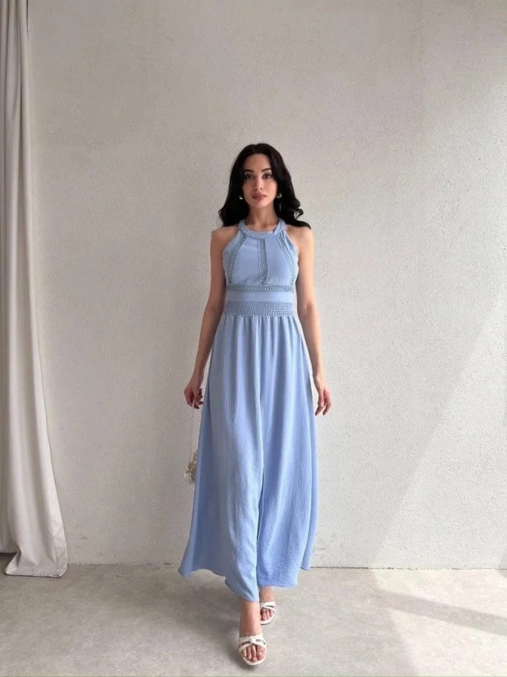 Kadın Krinkil Kumaş Beli Gipeli Halter Yaka Maxi Boy Elbise