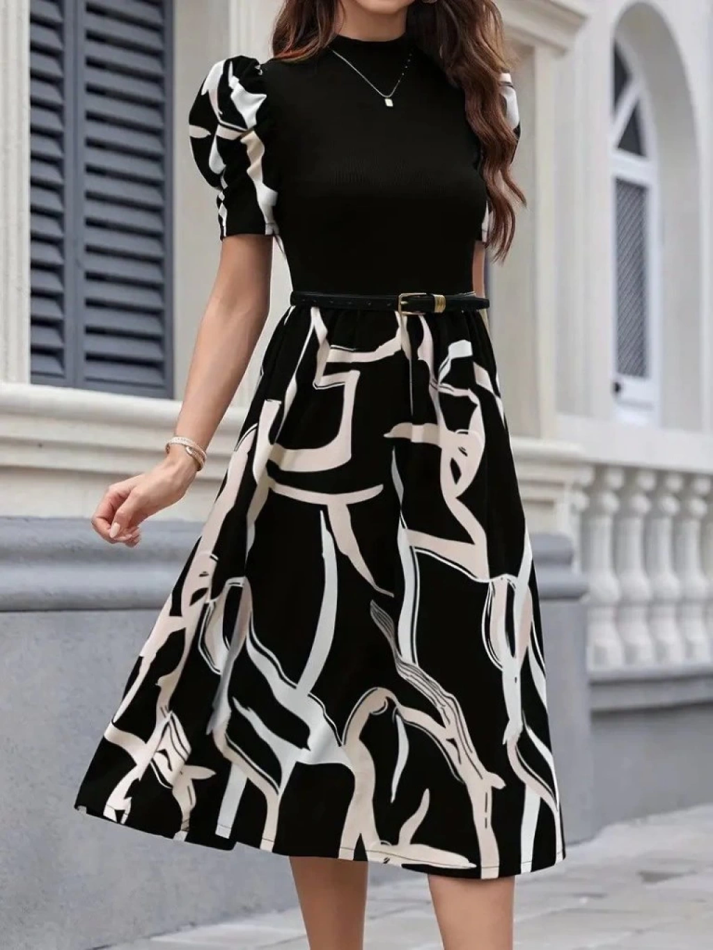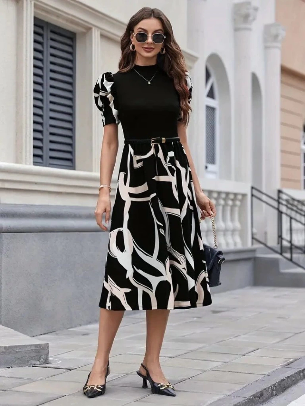 Kadın Kısa Kollu Yarı Balıkçı Yaka üst Viskon Alt Desenli Dokuma Midi Elbise