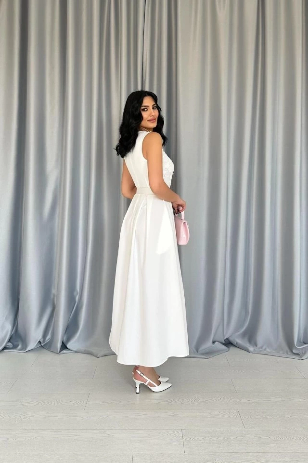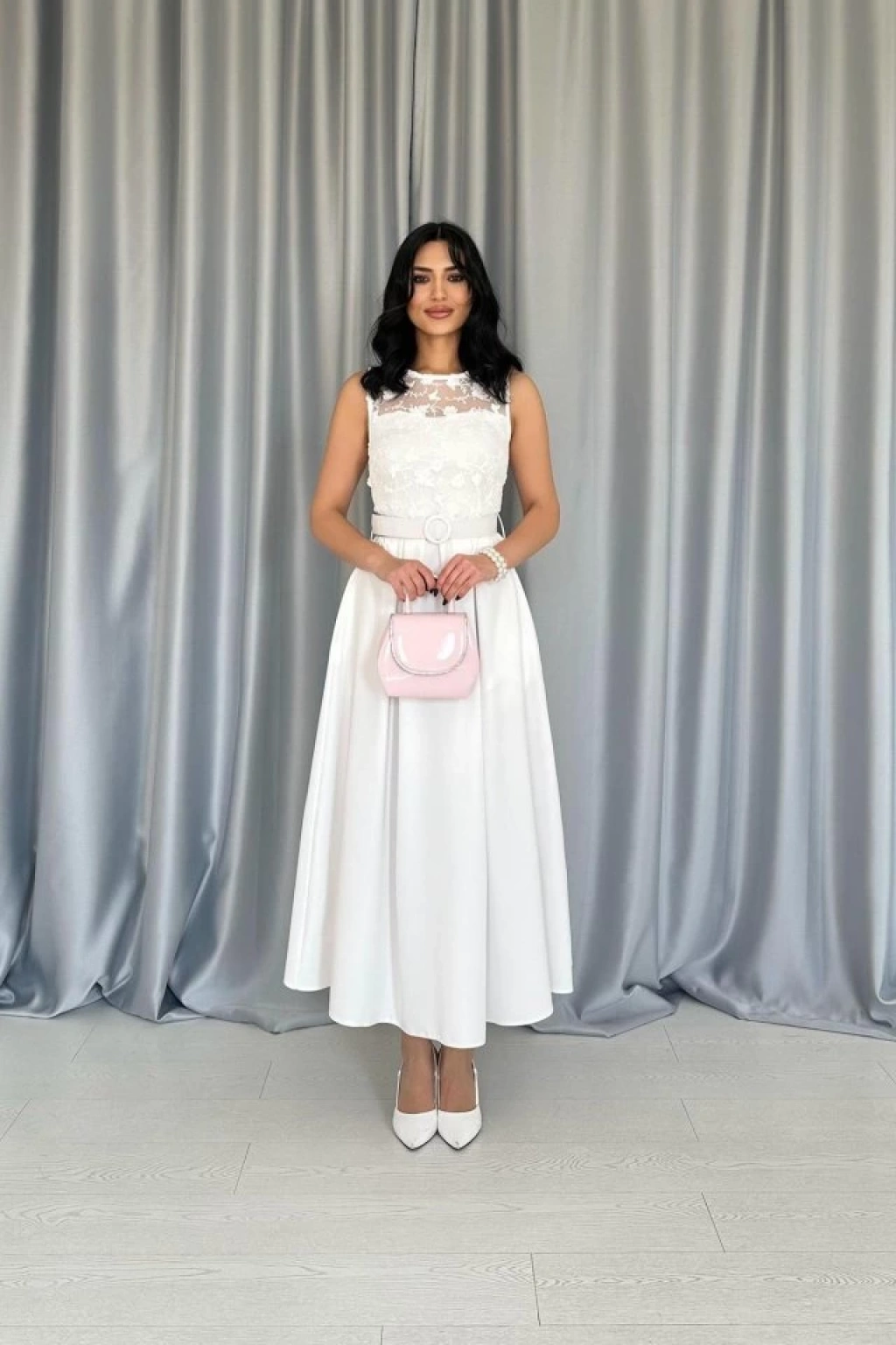 Beyaz Önü Dantel Detaylı Kemerli Elbise