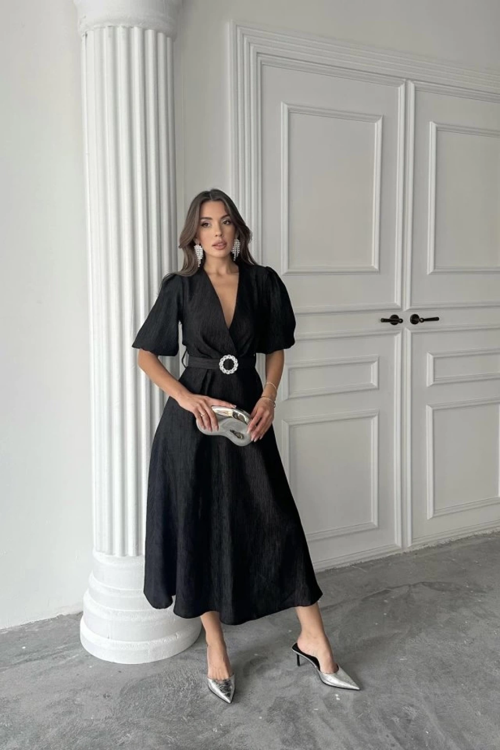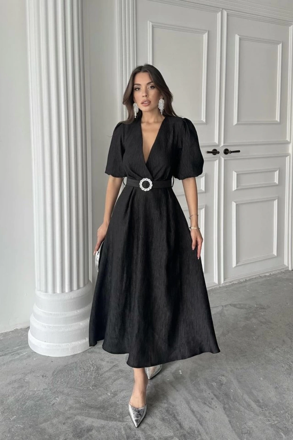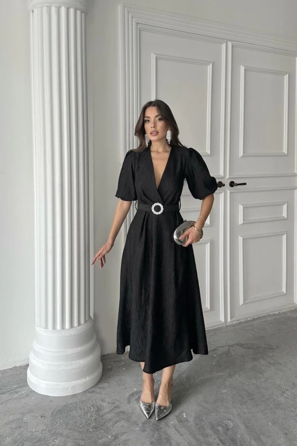 Siyah Işıltılı Kemerli Kruvaze Elbise