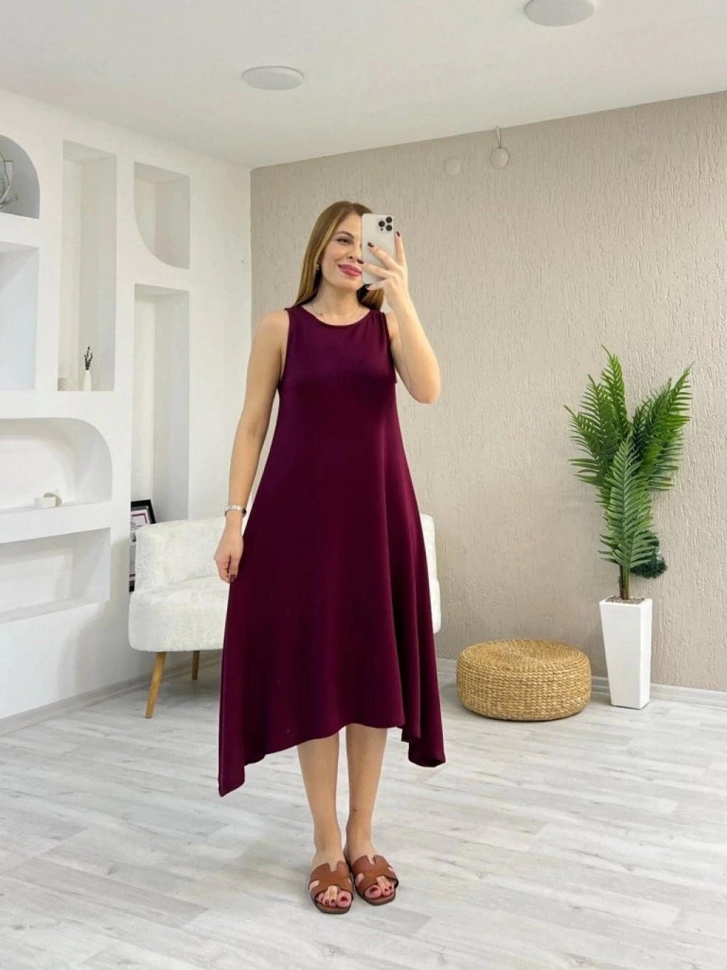 Kadın Askılı Yuvarlak Yakalı Asimetrik Kesim Detaylı Viskon Elbise