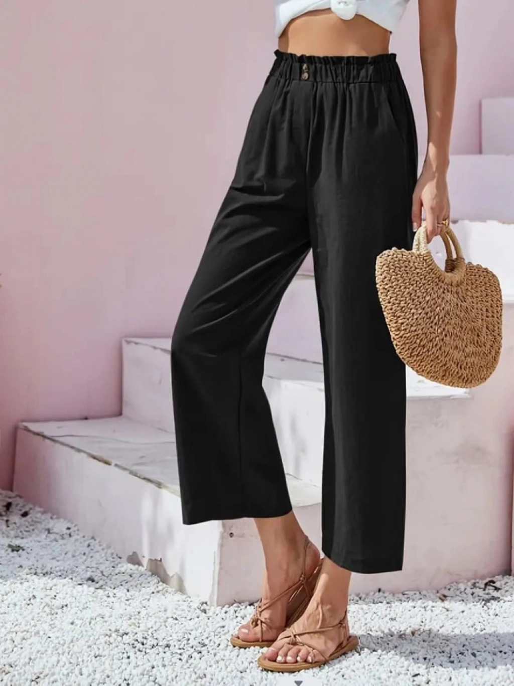 Kadın Bel Büzgü Ve Düğme Detay Kapri Keten Pantolon