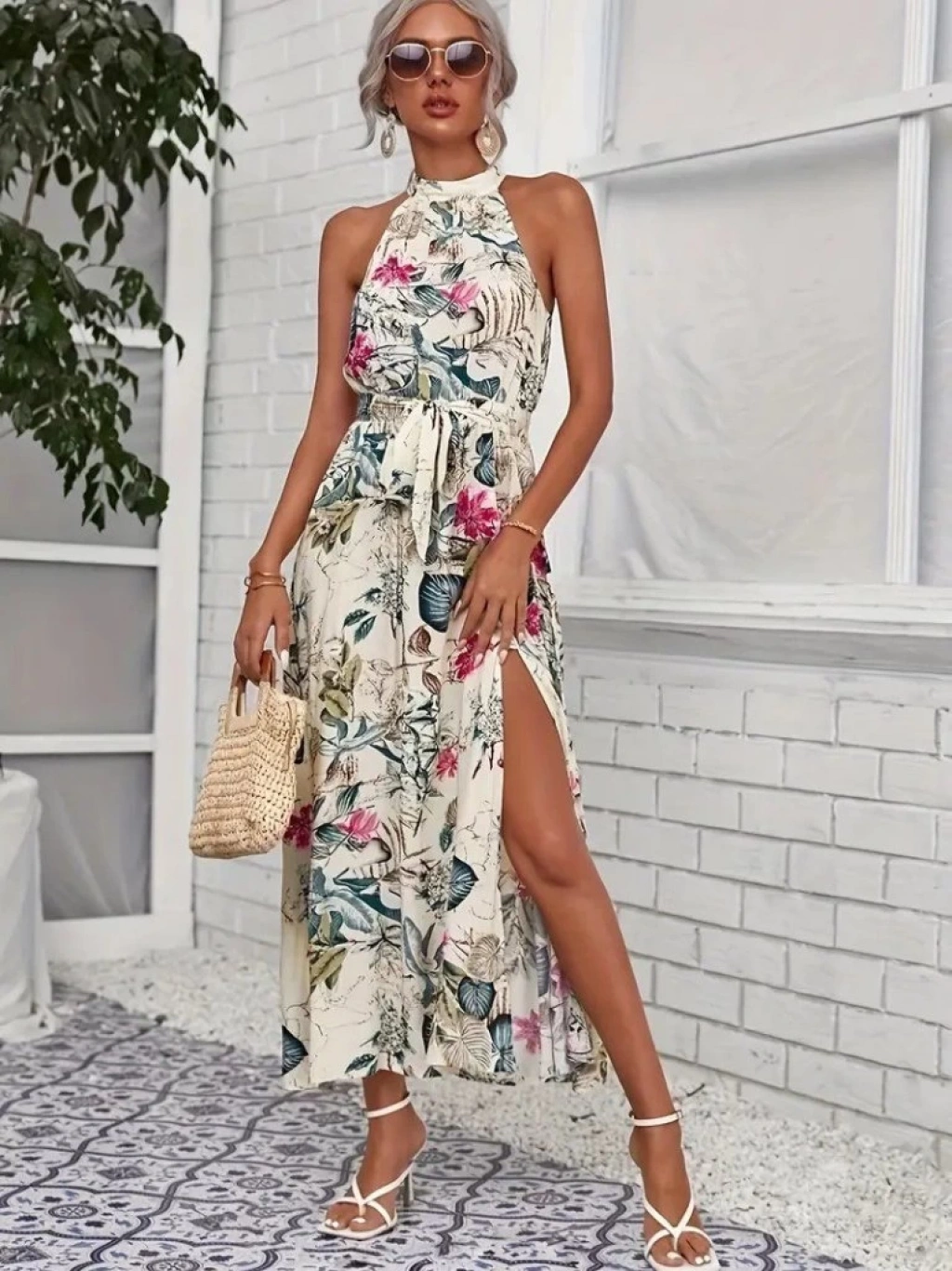 Kadın Omuzlardan Açık Halter Yakalı Yırtmaçlı çiçek Desenli Süprem Elbise