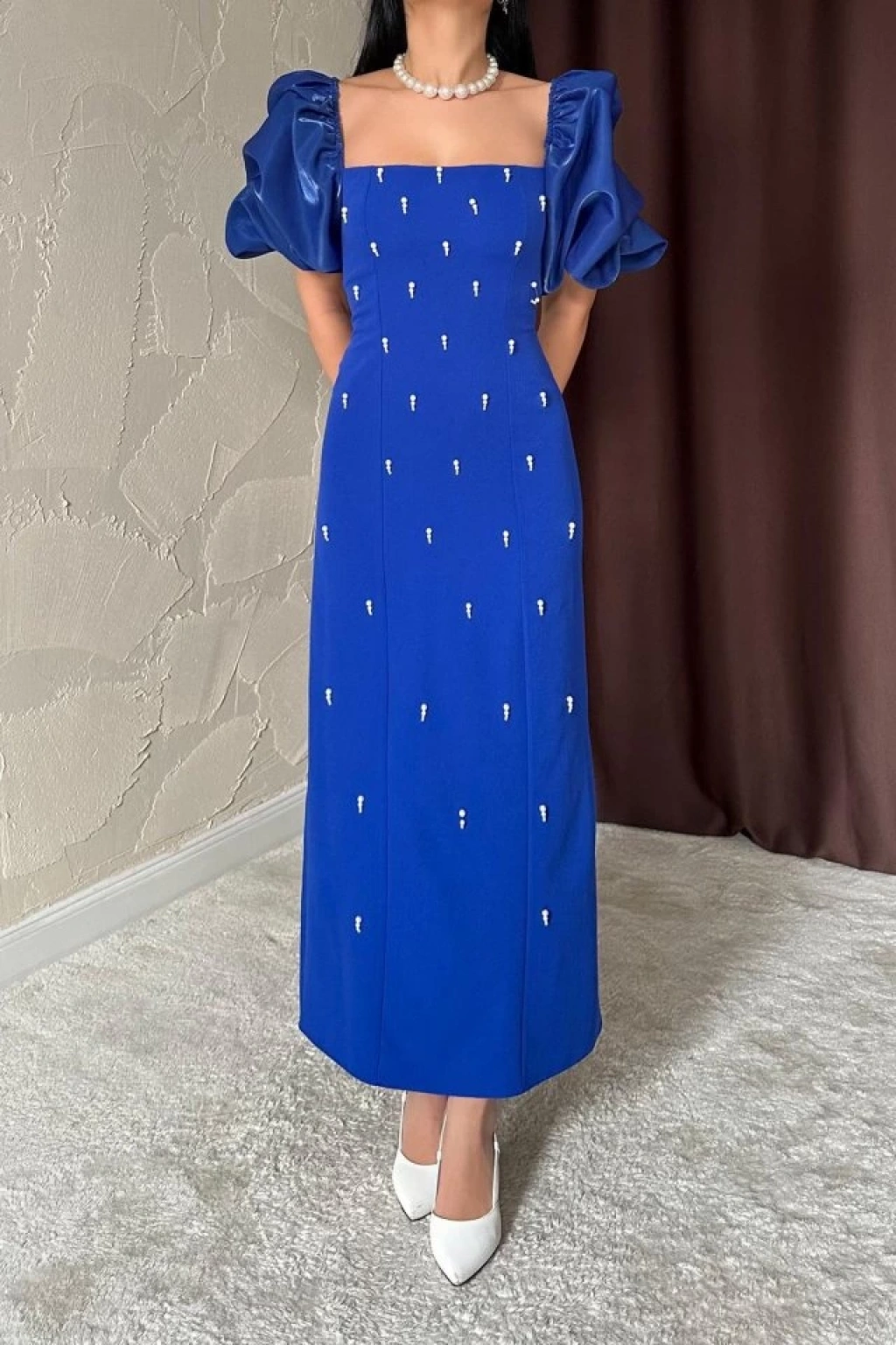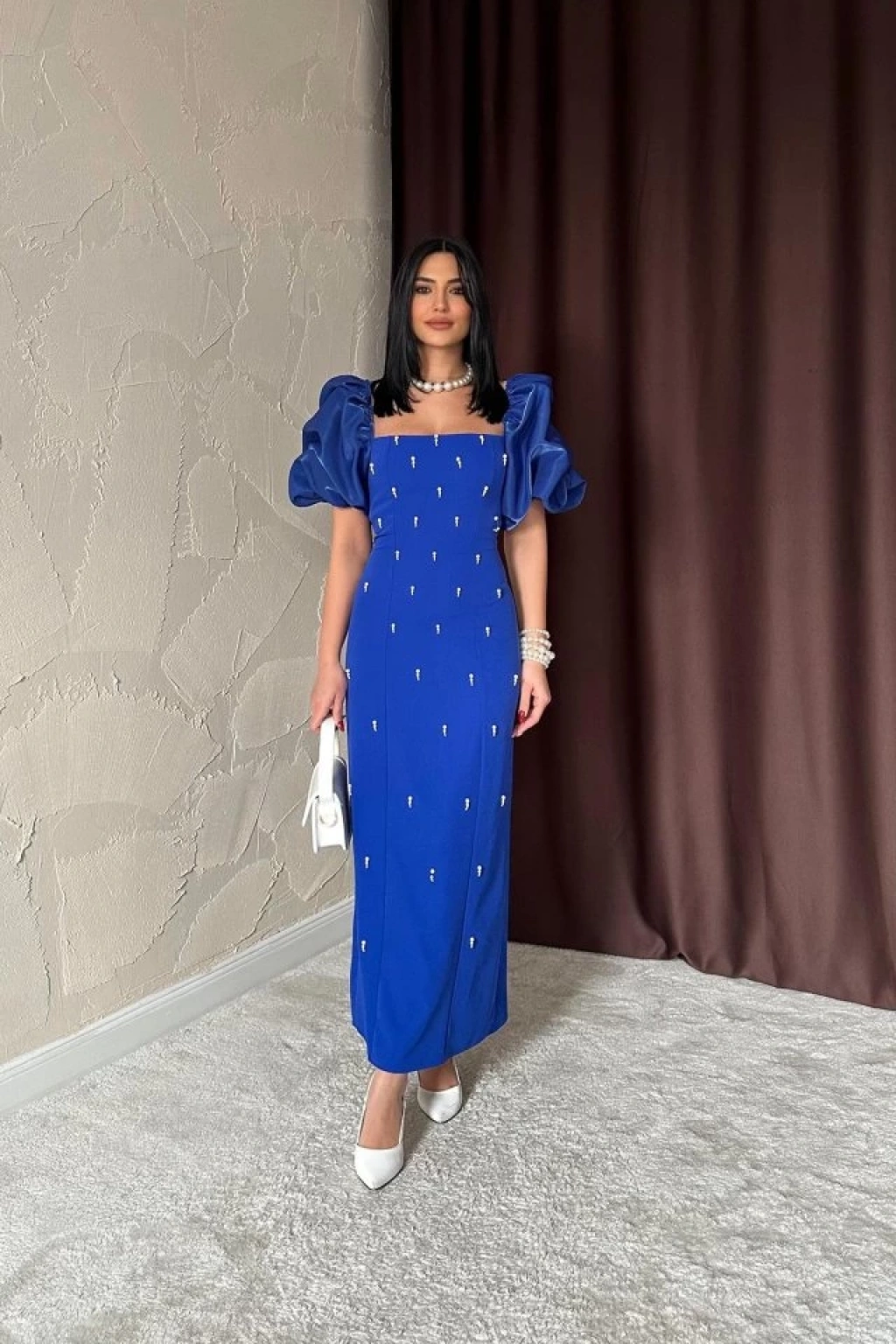 Saks İşlemeli Kolu Garnili Elbise