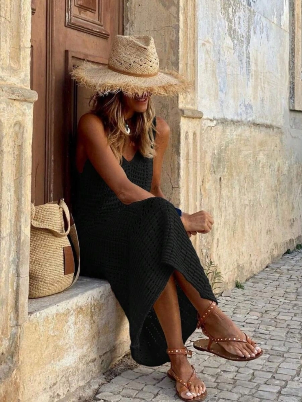 Kadın V Yaka Tam Askılı Tam Boy Ajurlu Triko Elbise