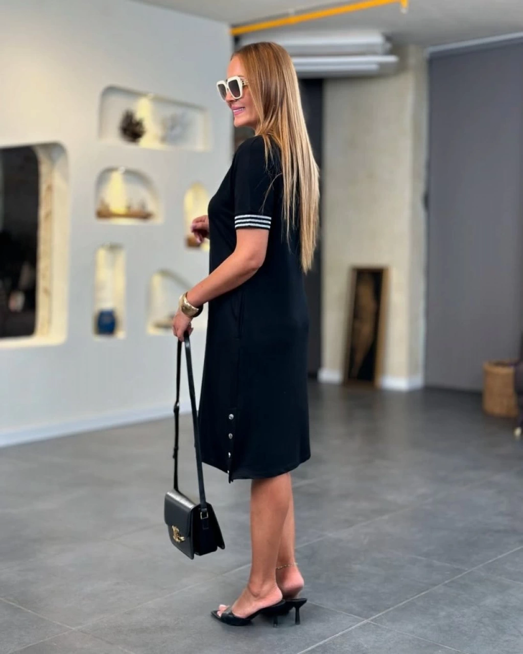 Kadın Kısa Kollu V Yakalı Yanlardan Yırtmaç Ve Düğmeli Viskon Iki Iplik Elbise