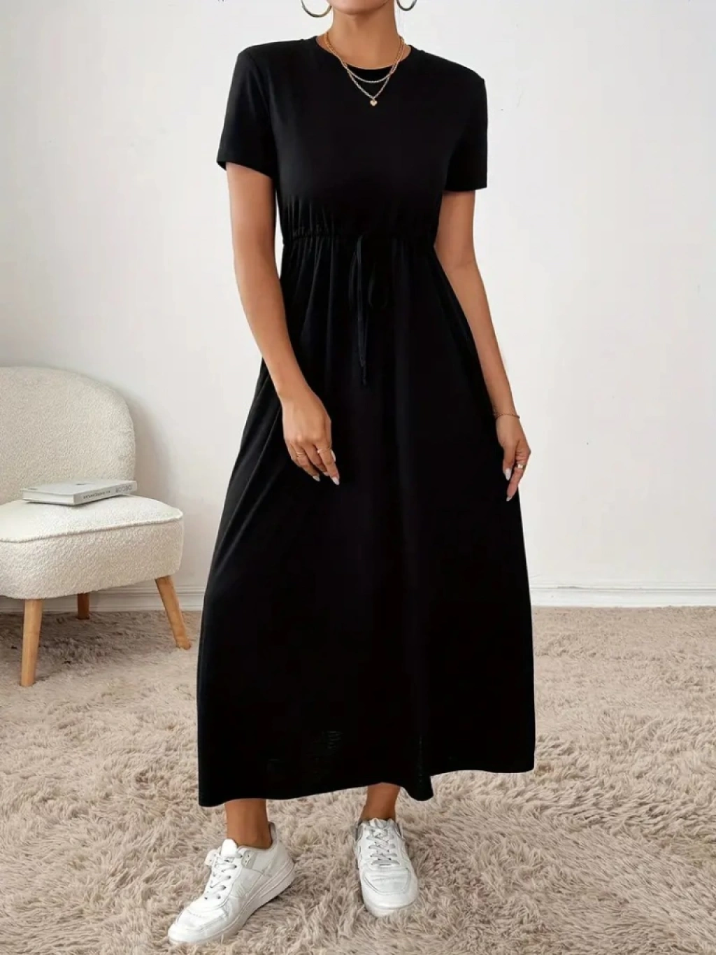 Kadın Kısa Kollu Bisiklet Yaka Belden Bağcıklı Cepli Viskon Elbise