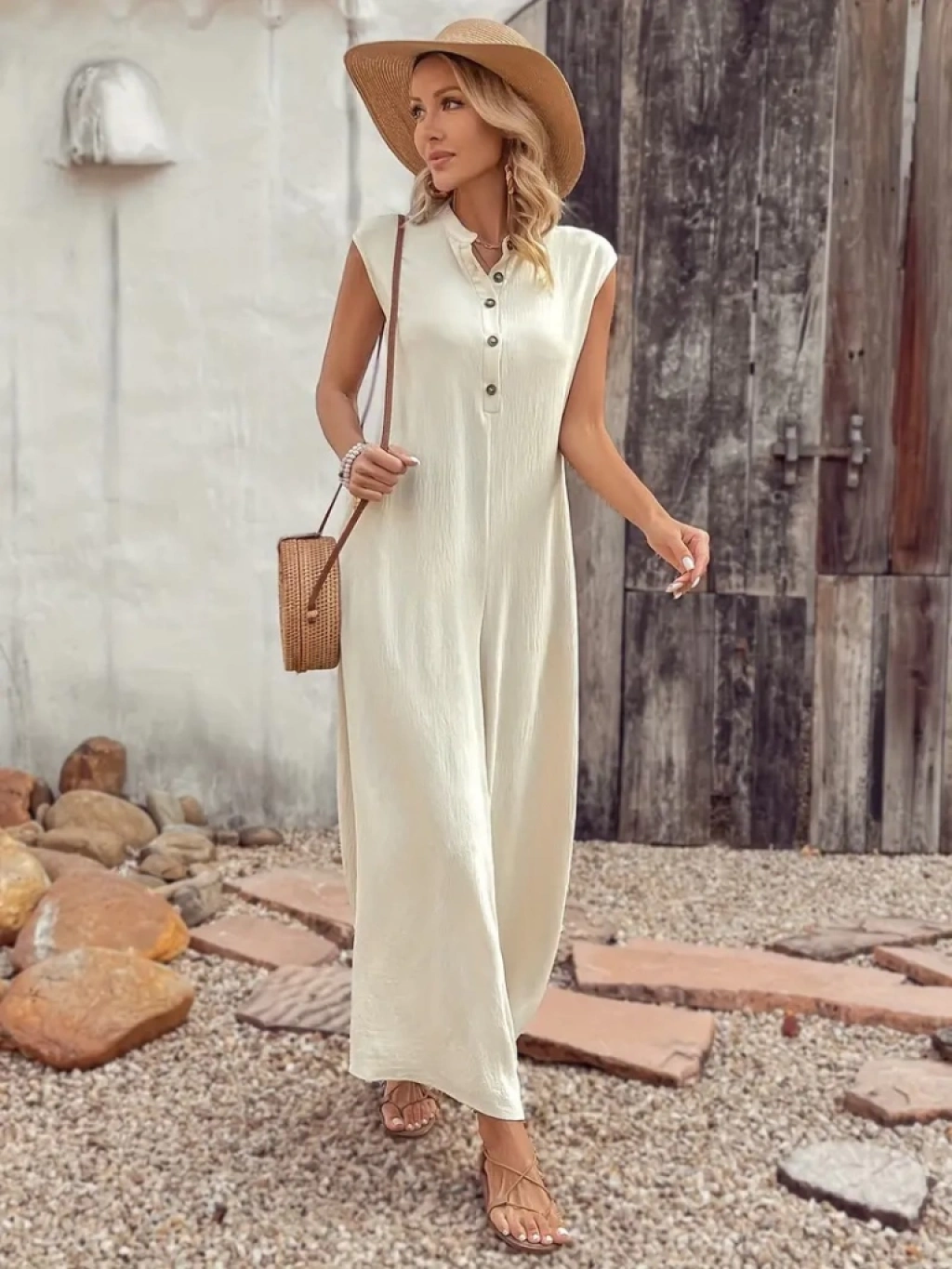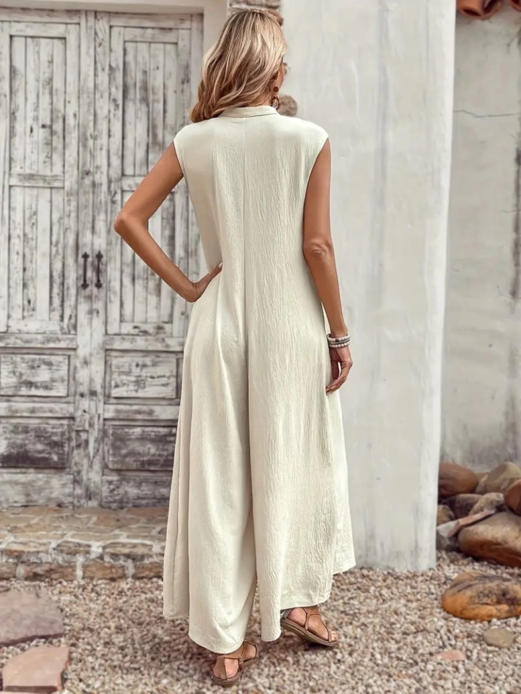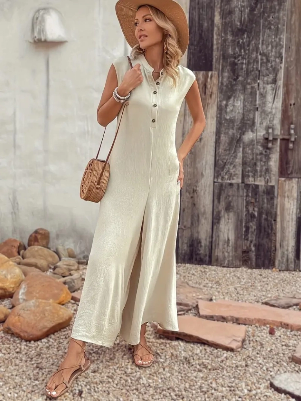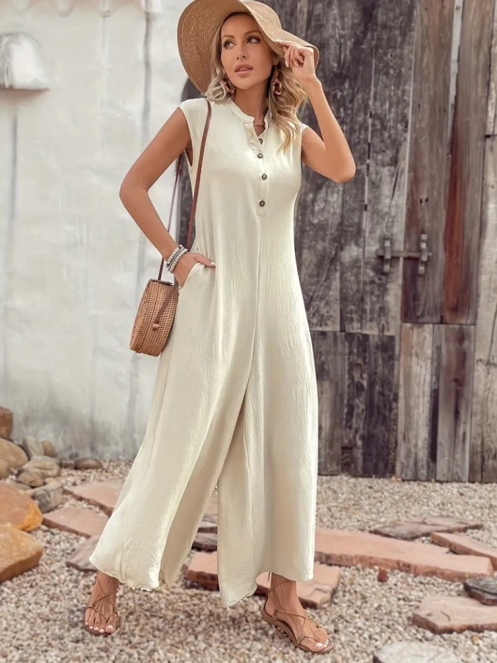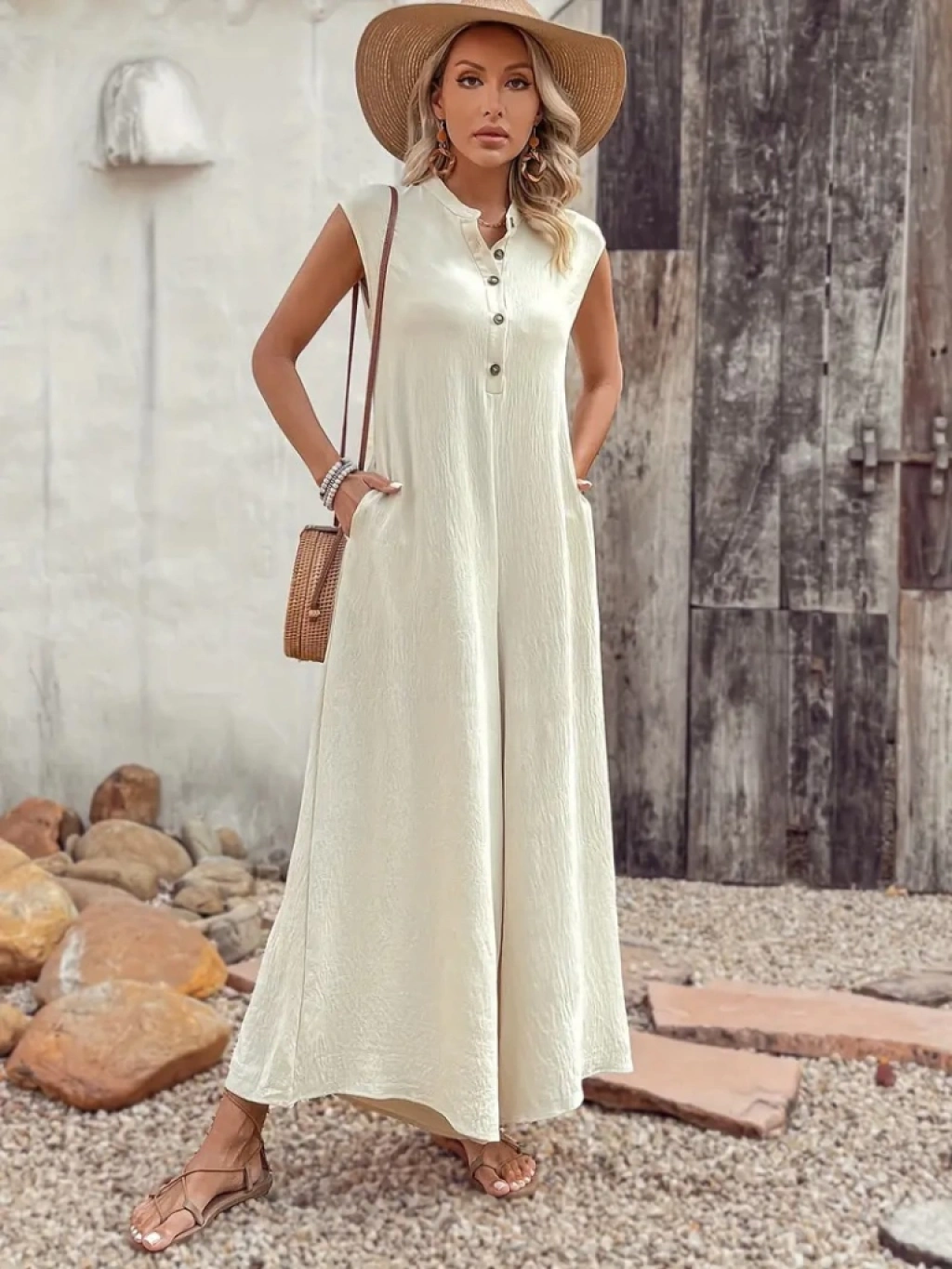 Kadın Kısa Kollu önden Düğmeli Paçaya Doğru Geniş Cepli Uzun Bürümcük Tulum