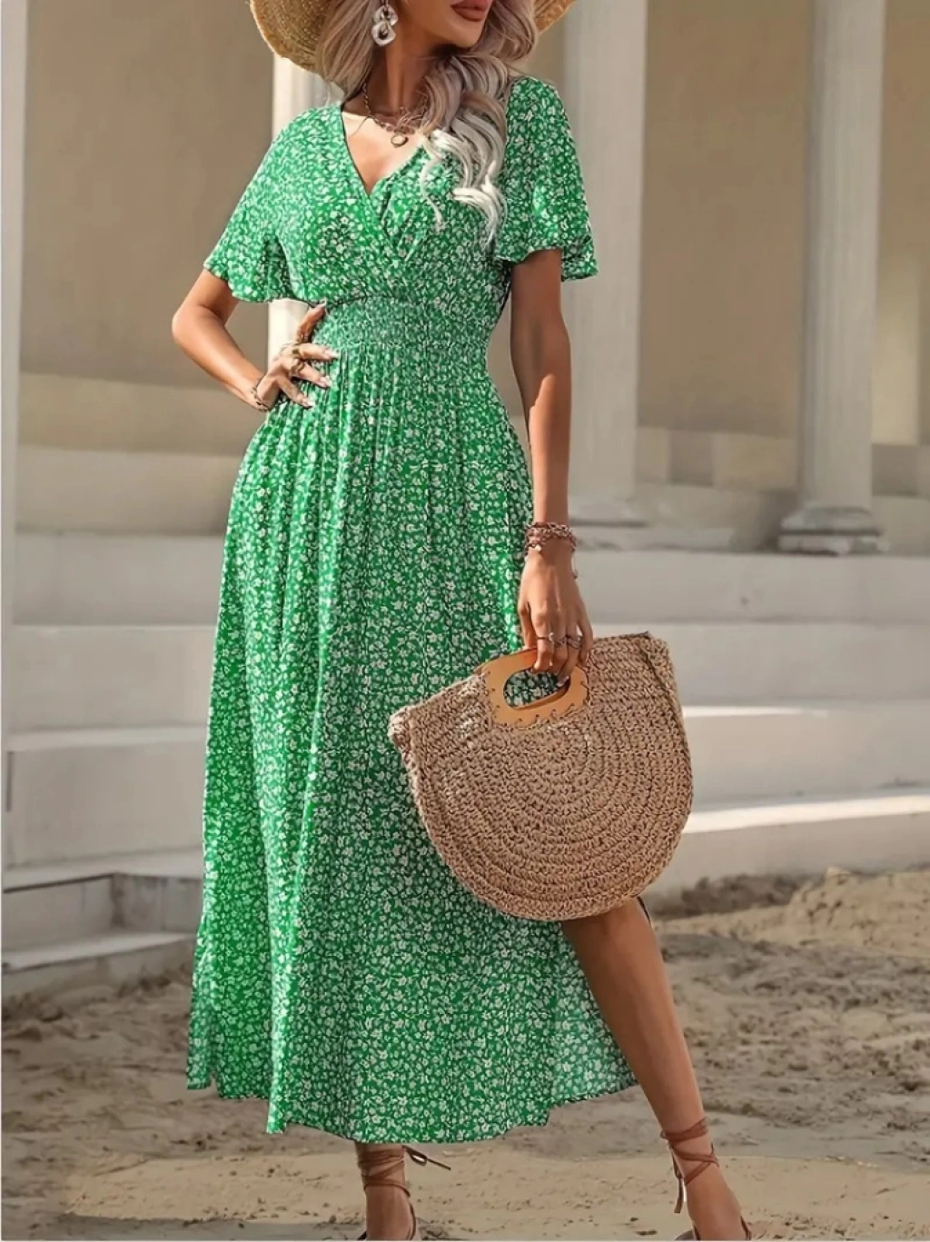 Kadın Kısa Kollu Kruvaze Yaka Beli Lastikli Yanlardan Yırtmaçlı Uzun çiçekli Elbise