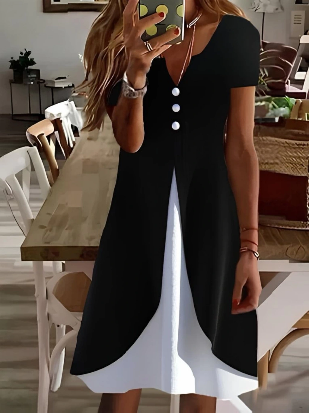 Kadın Kısa Kollu V Yakalı önden Düğmeli çift Renkli Viskon Elbise