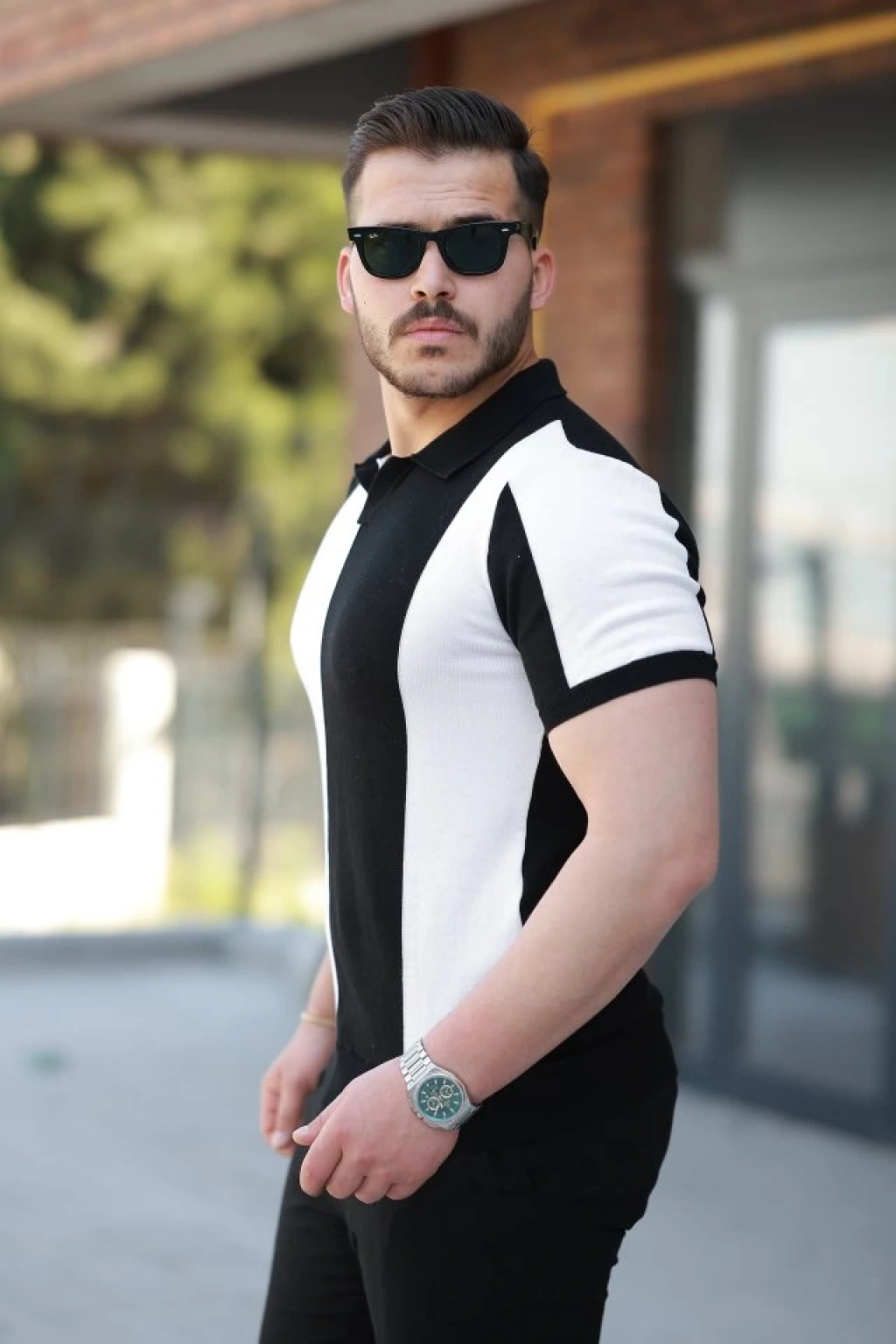 Erkek Kısa Kollu Polo Yakalı Blok Desenli Triko Bluz