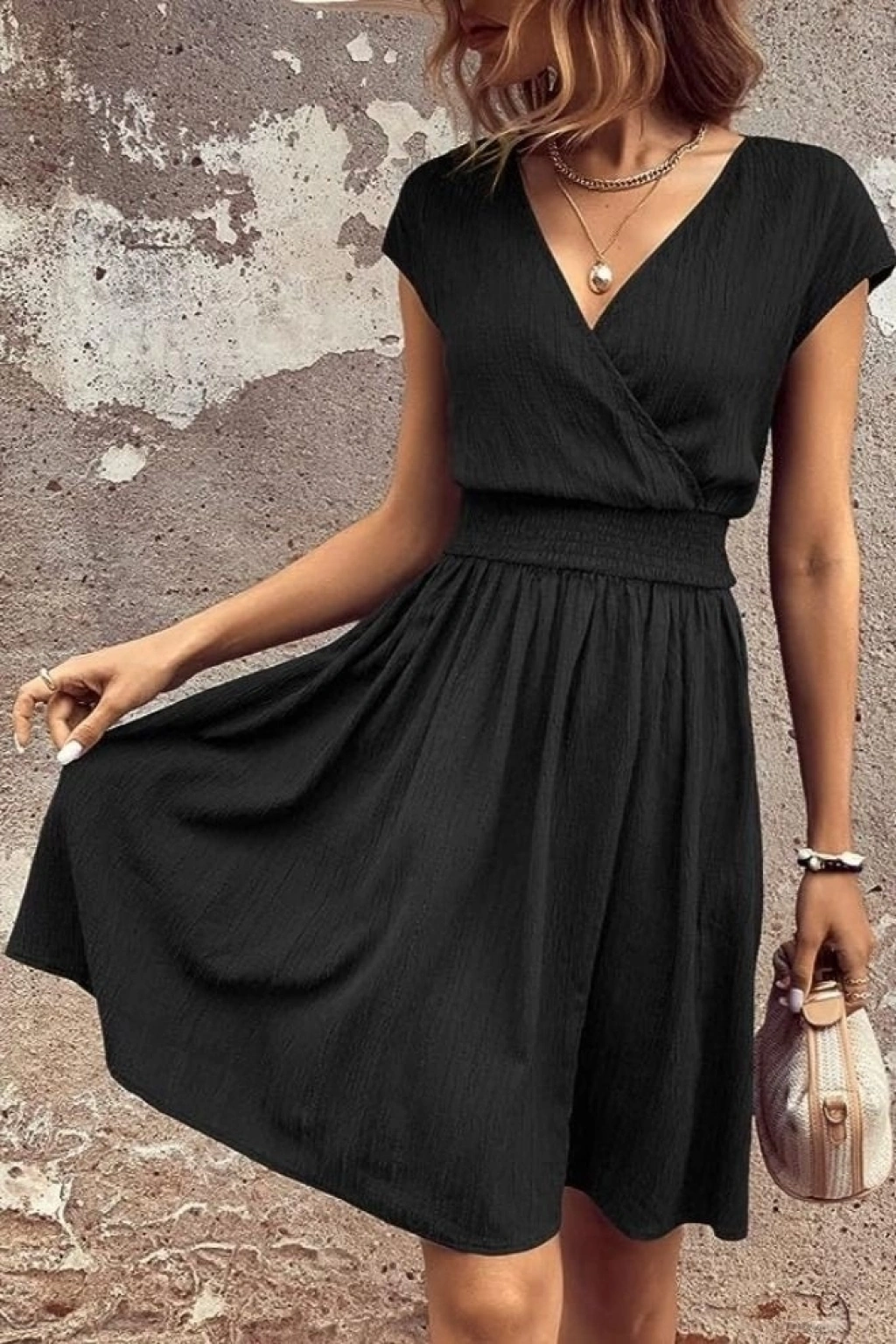 Kadın Kısa Kollu Kruvaze Yaka Beli Gipeli Bürümcük Elbise