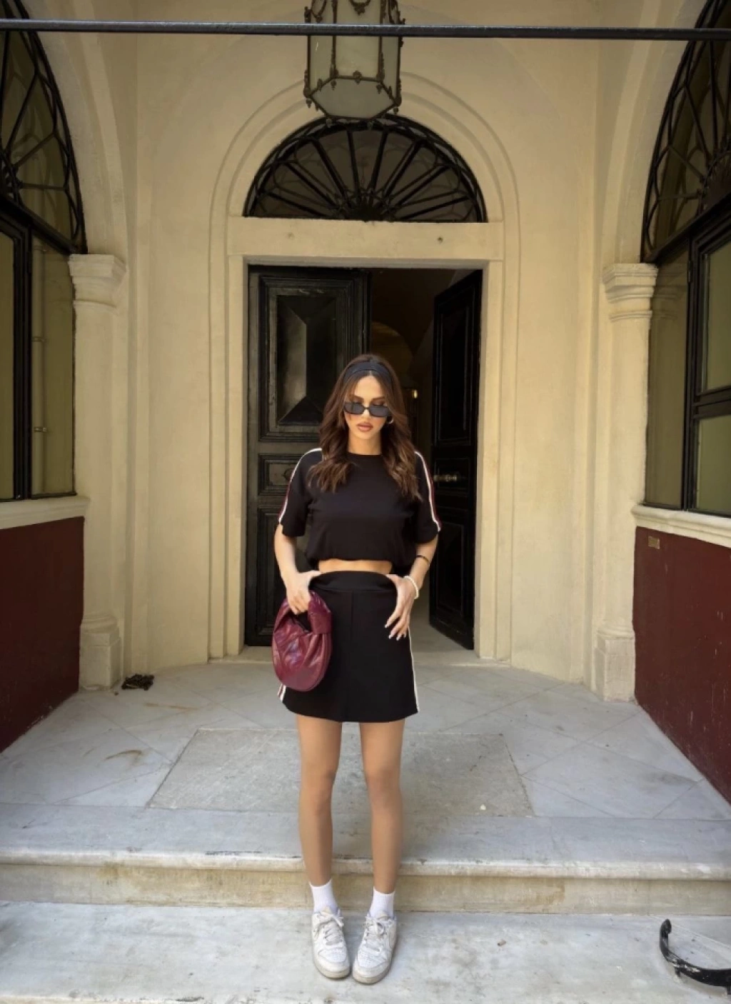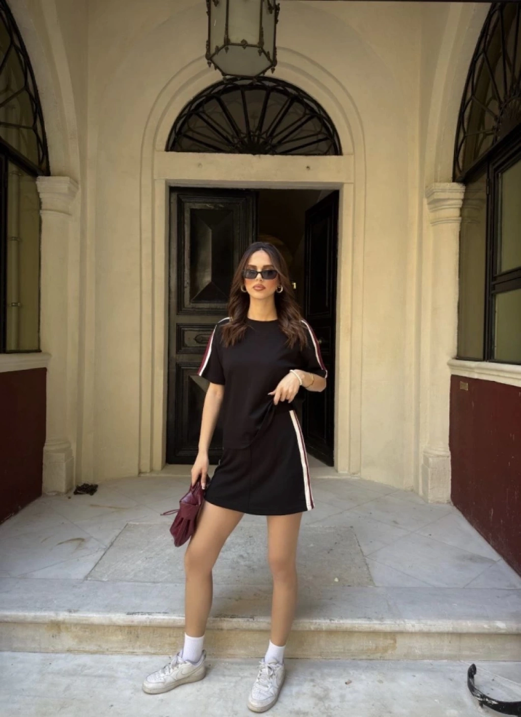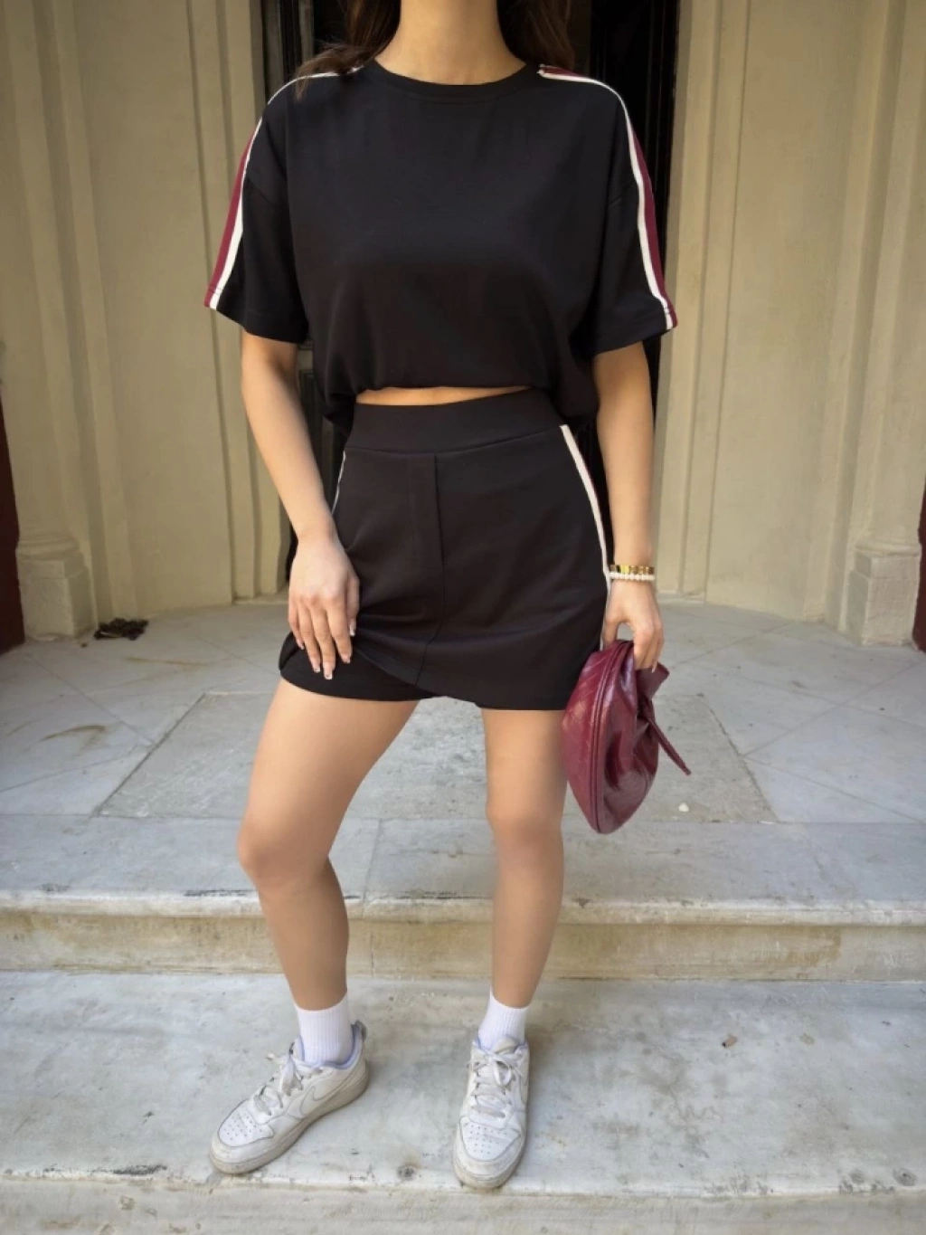 Osy Modal Yumuşak Dokulu Kumaş Parçalı Bisiklet Yaka T-shirt Mini Şortlu Etek İkili Takım - Siyah
