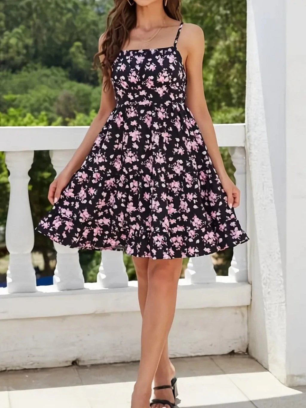 Kadın Askılı çiçek Desenli Süprem Mini Elbise