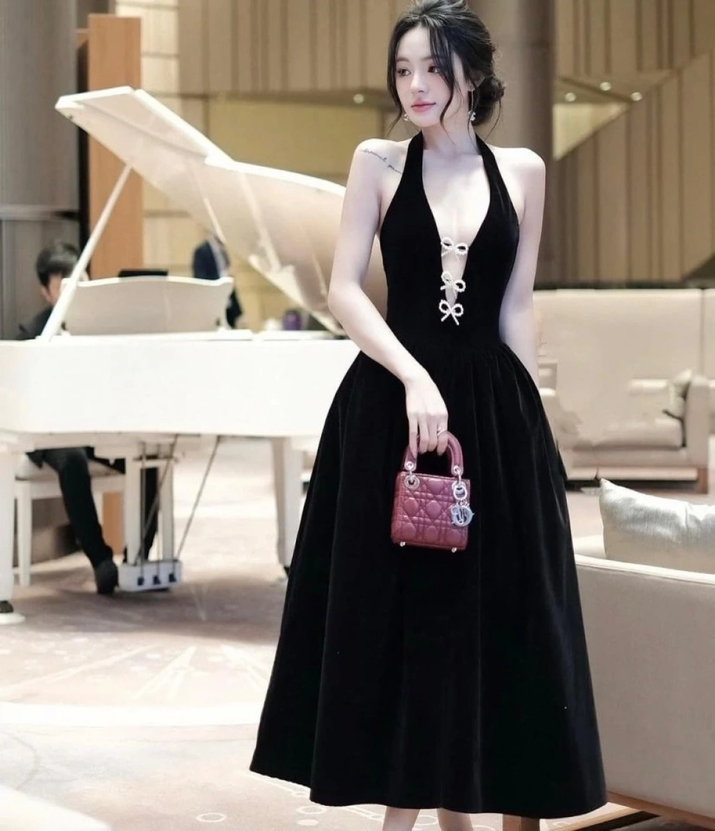 Kadın Derin V Yaka Kurdele Detaylı İthal Double Kumaş Elbise