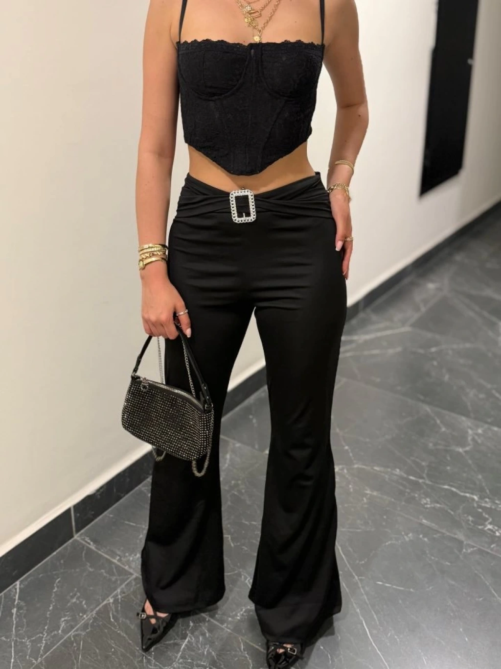 Kadın Yüksek Bel Tokalı Ispanyol Paçalı Dalgıç Pantolon