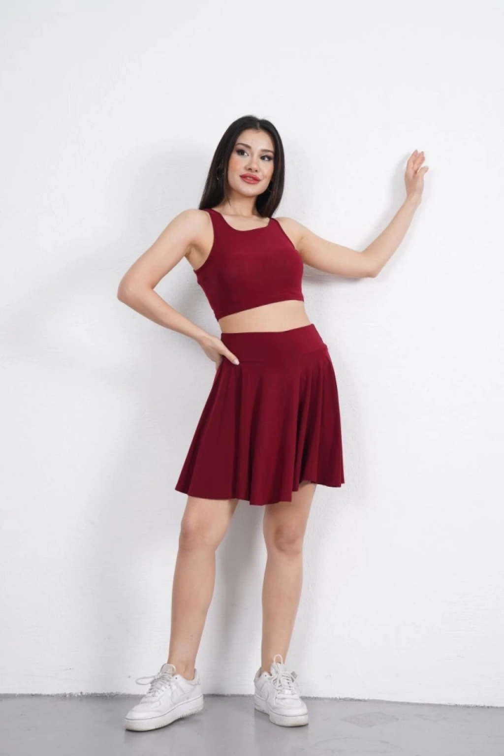 Sendy Kumaş Bisiklet Yaka Crop Şortlu Etek Ikili Takım - Bordo
