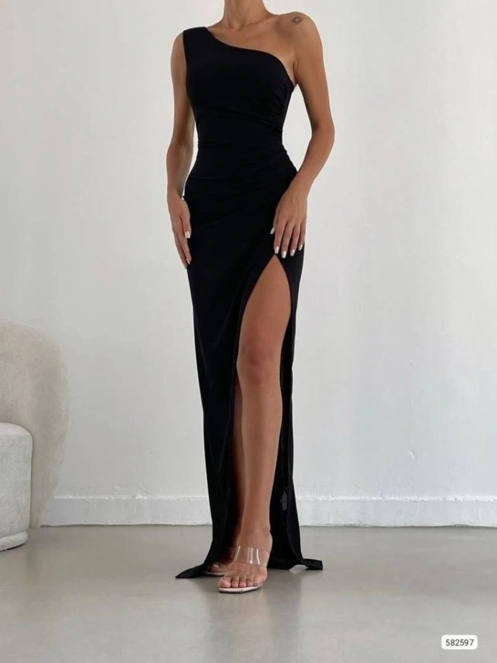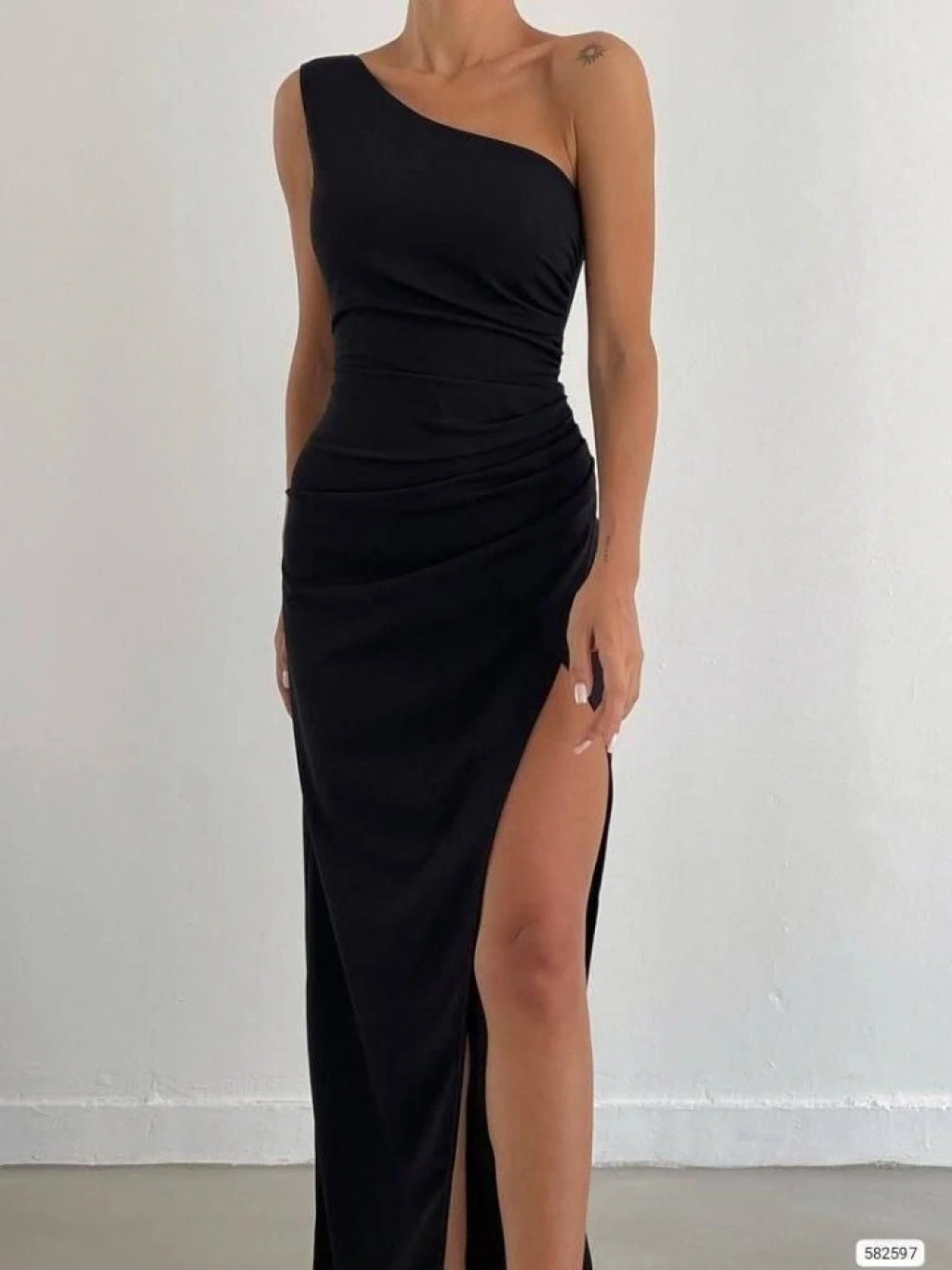 Kadın Dalgıç Krep Kumaş Tek Omuz Yırtmaç Detaylı Maxi Boy Elbise