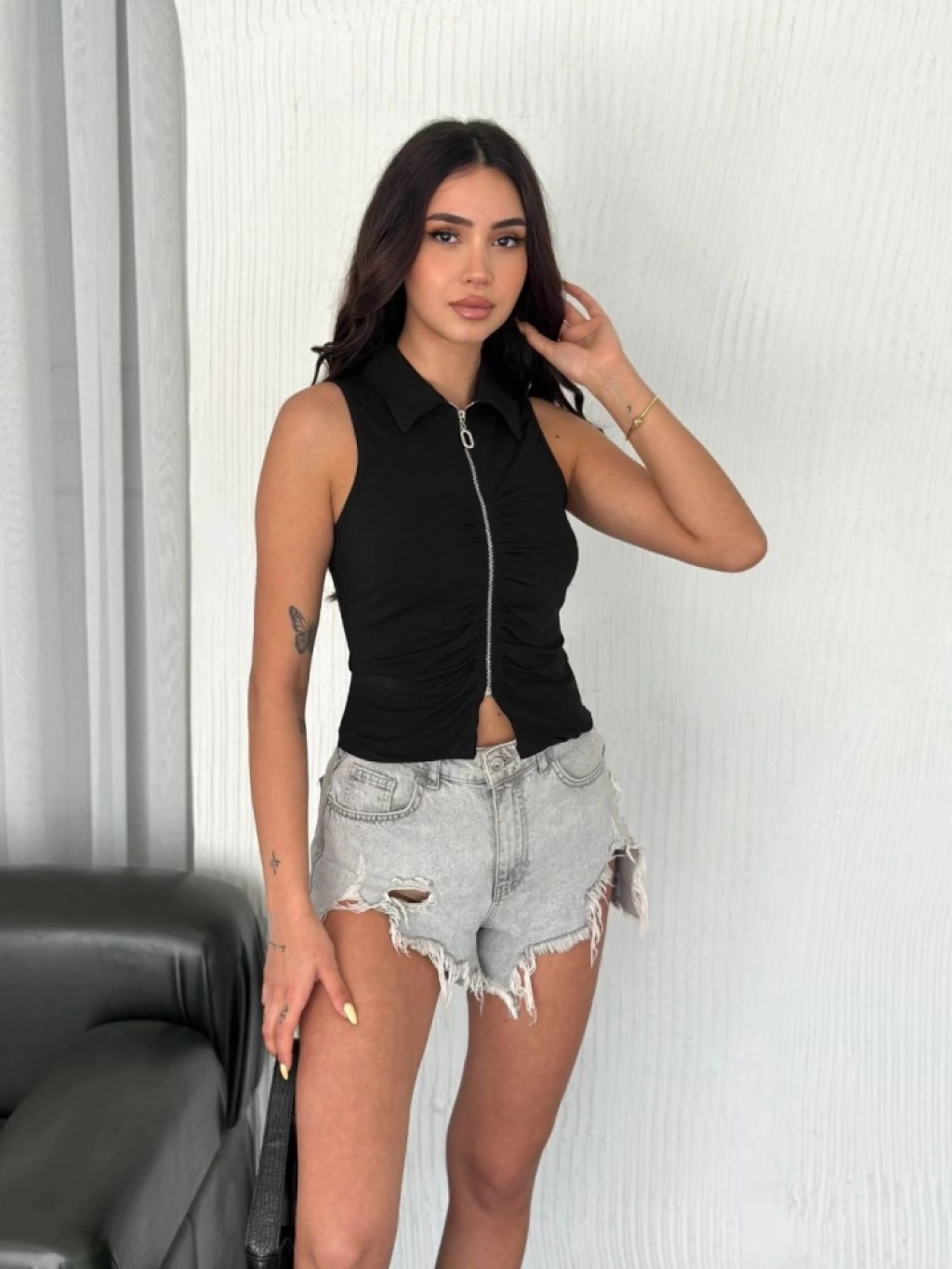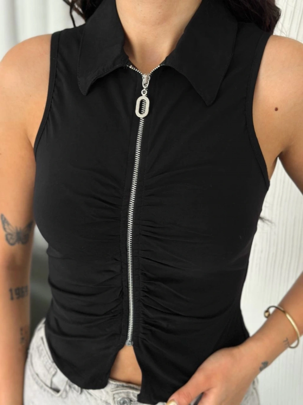 Yakalı Tam Fermuarlı Kolsuz Bluz - Siyah