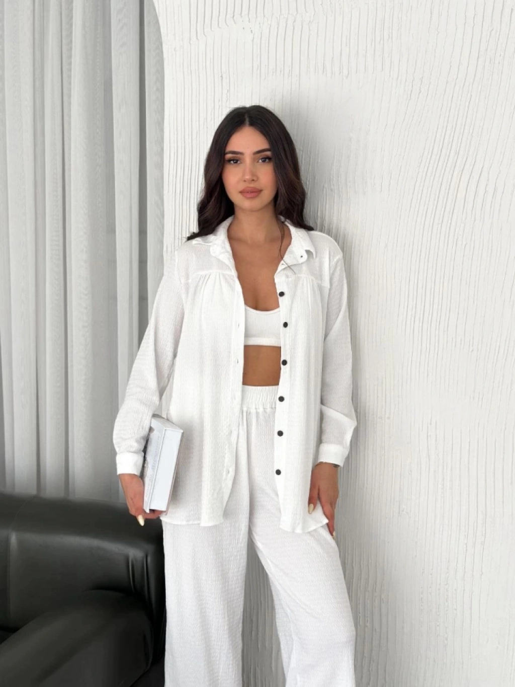 Yakalı Düğmeli Uzun Kollu Gömlek Pantolon Ikili Takım - Beyaz