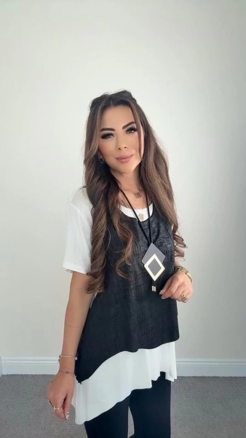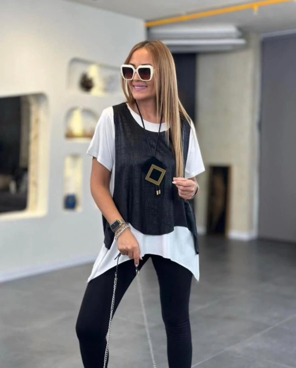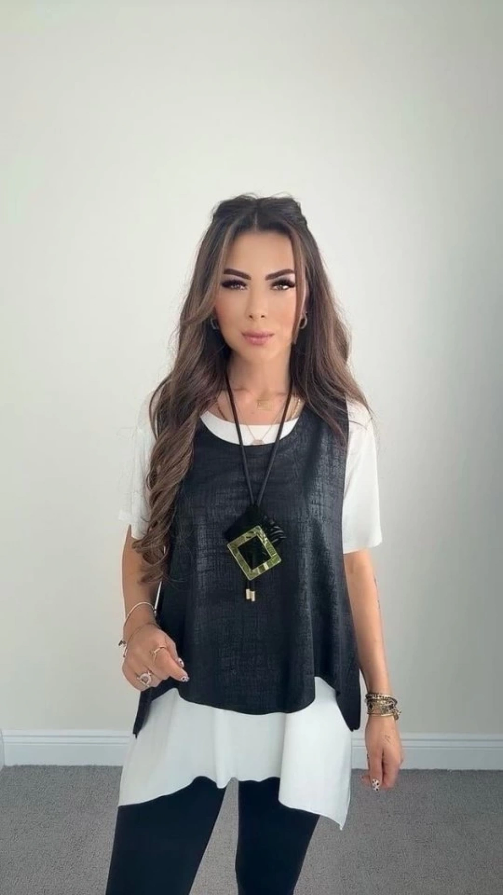 Kadın Kısa Kollu Bisiklet Yaka Yelek Bluz Asimetrik Kesim İkili Takım