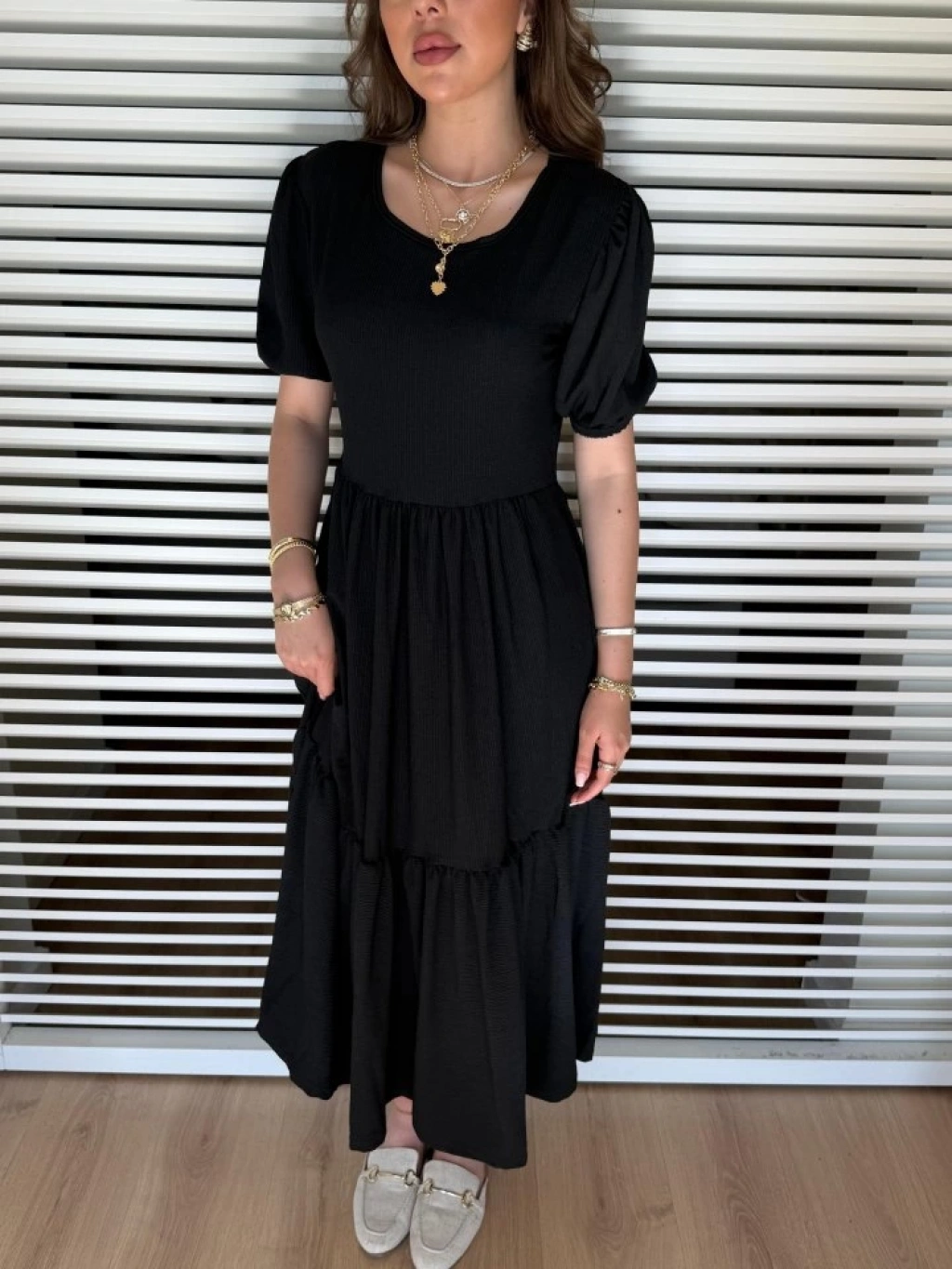 Kadın Kısa Kollu Yakası Açık Katlı Bürümcük Balon Elbise