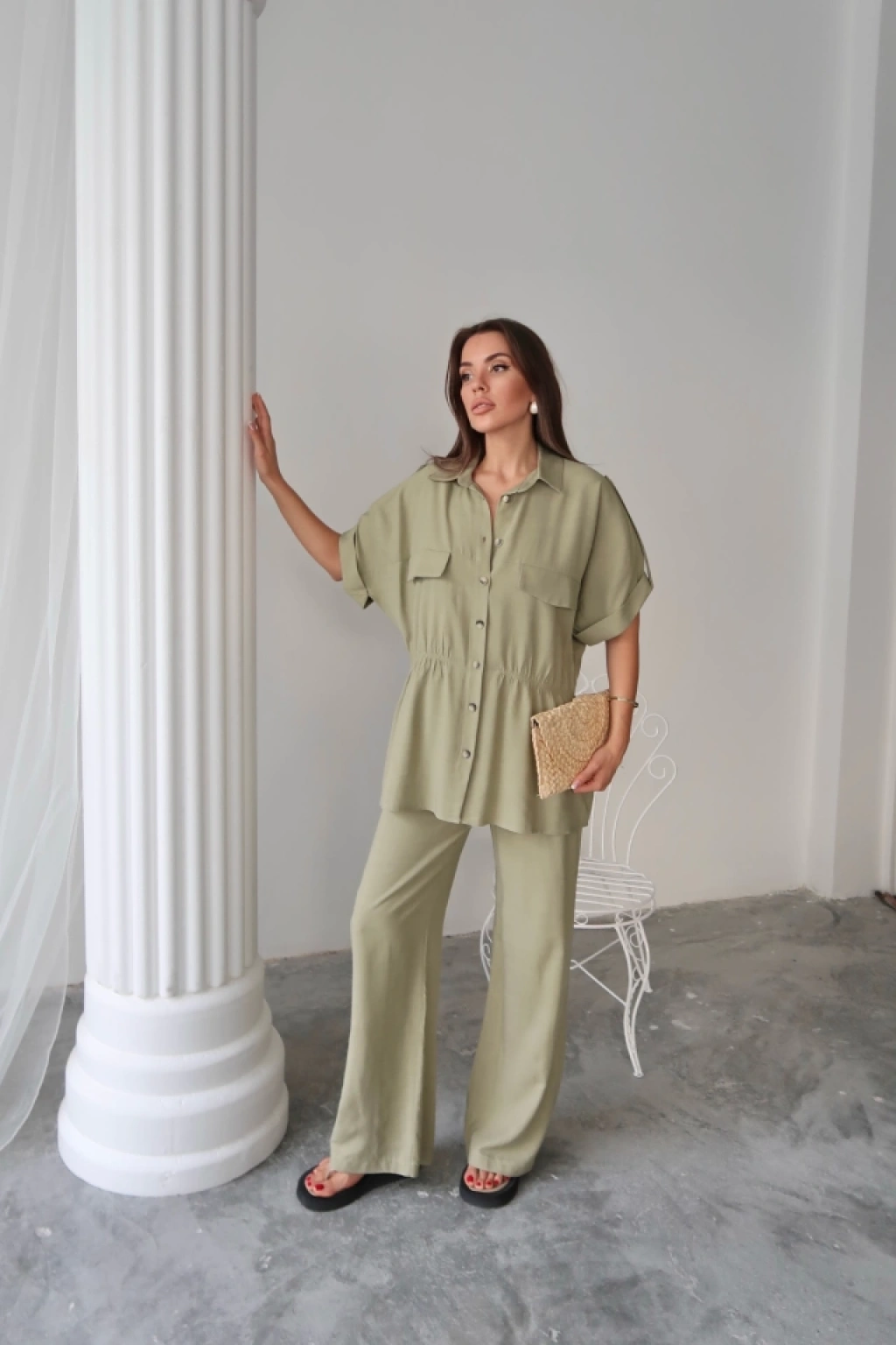 KETEN BELDEN BÜZGÜ DETAYLI GÖMLEK - PANTOLON TAKIM - Yeşil