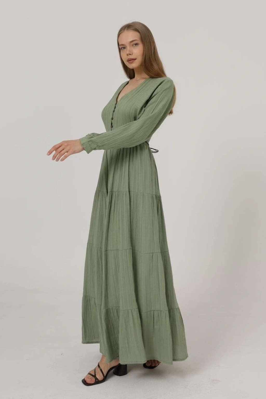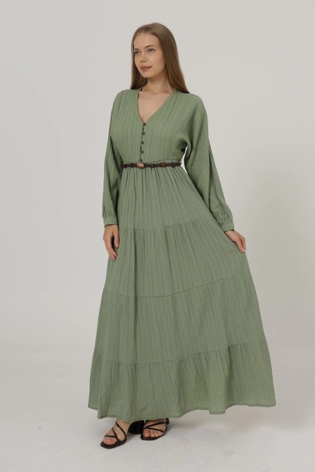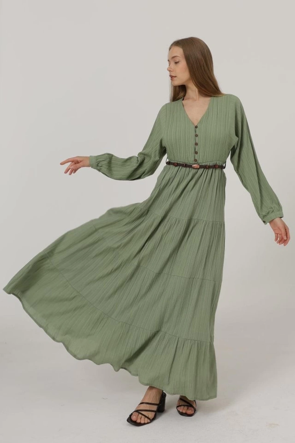Önü Yarım Düğmeli Uzun Kol Kemerli Elbise - Haki