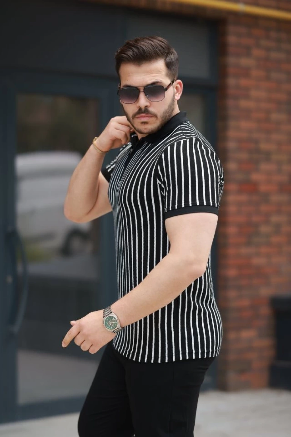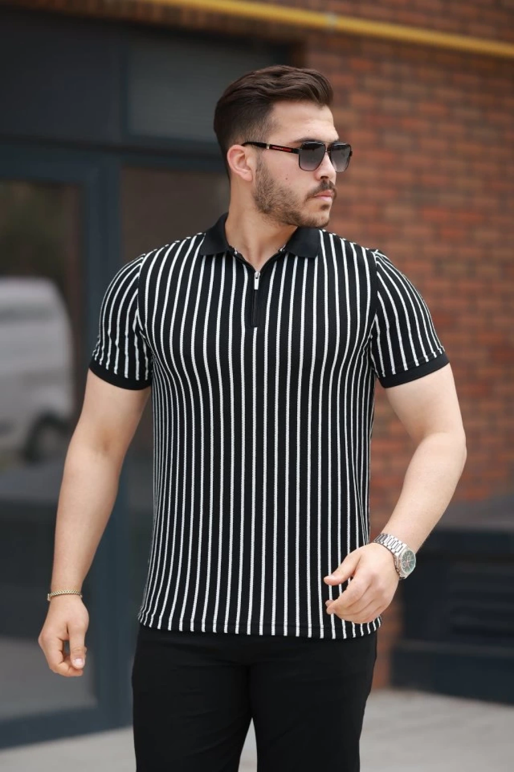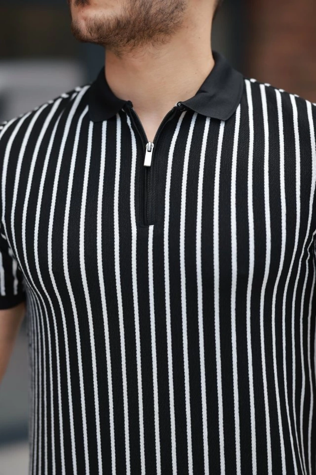 Erkek çizgili Fermuar Yakalı Kısa Kollu Tişört