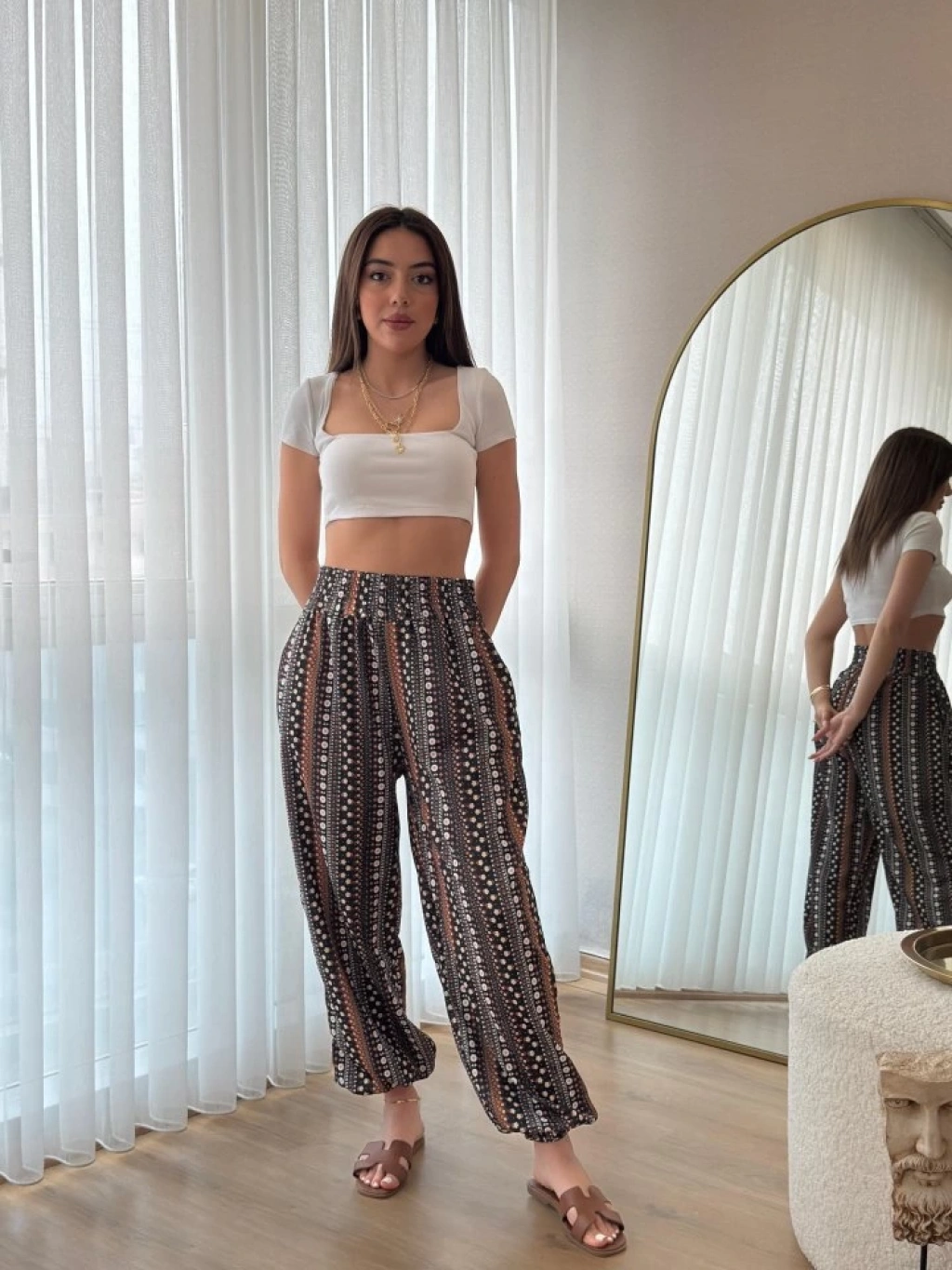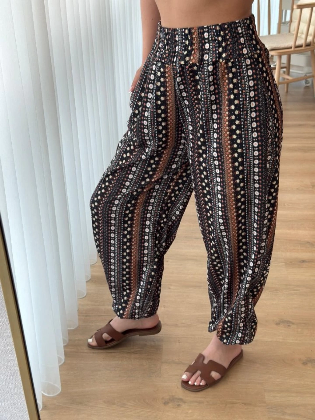 Kadın Yüksek Bel Etnik Desenli Geniş Dökümlü Bürümcük Pantolon