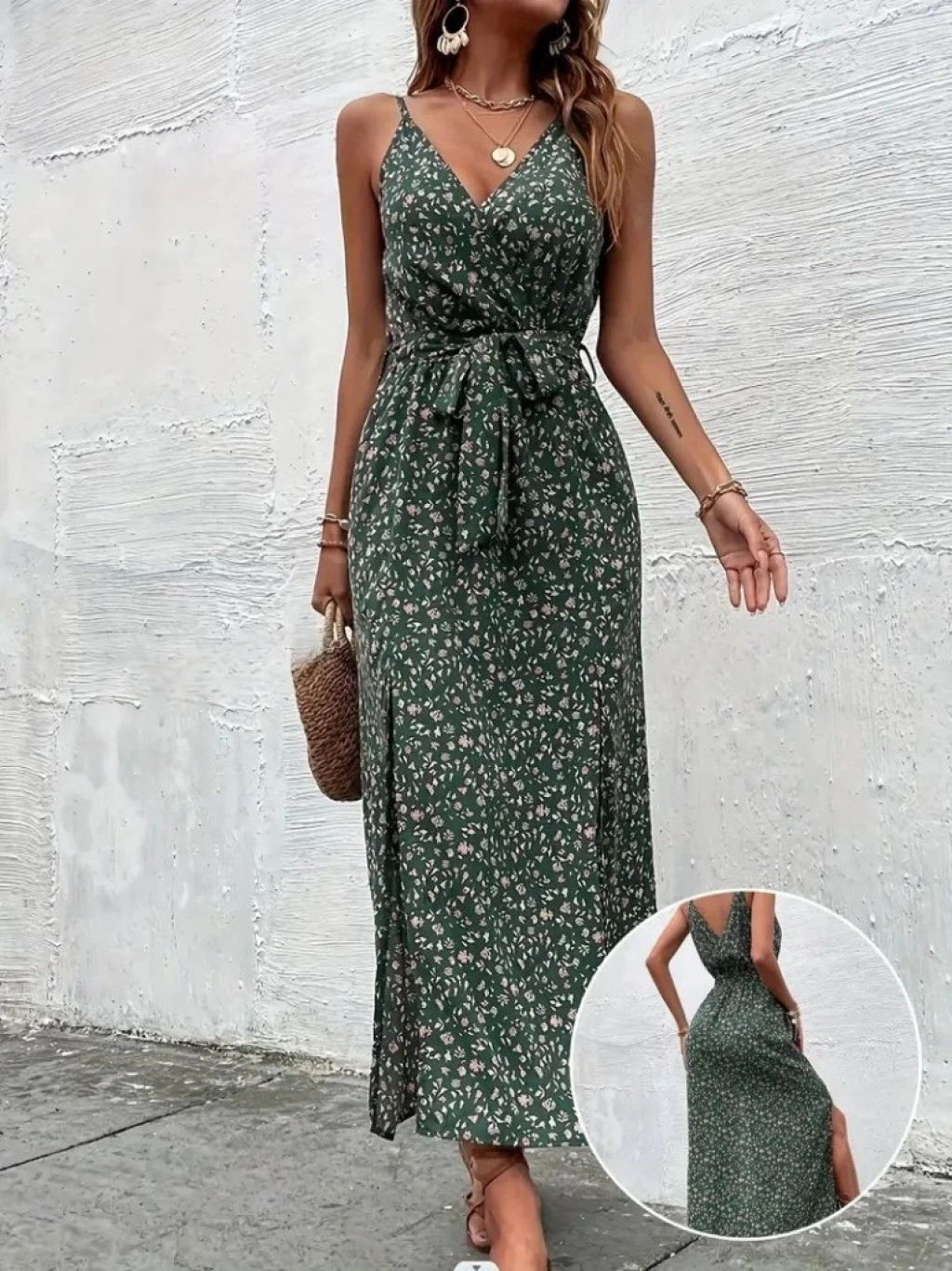 Kadın Ip Askılı Kruvaze Yakalı Yırtmaçlı Uzun Desenli Kuşaklı Süprem Elbise
