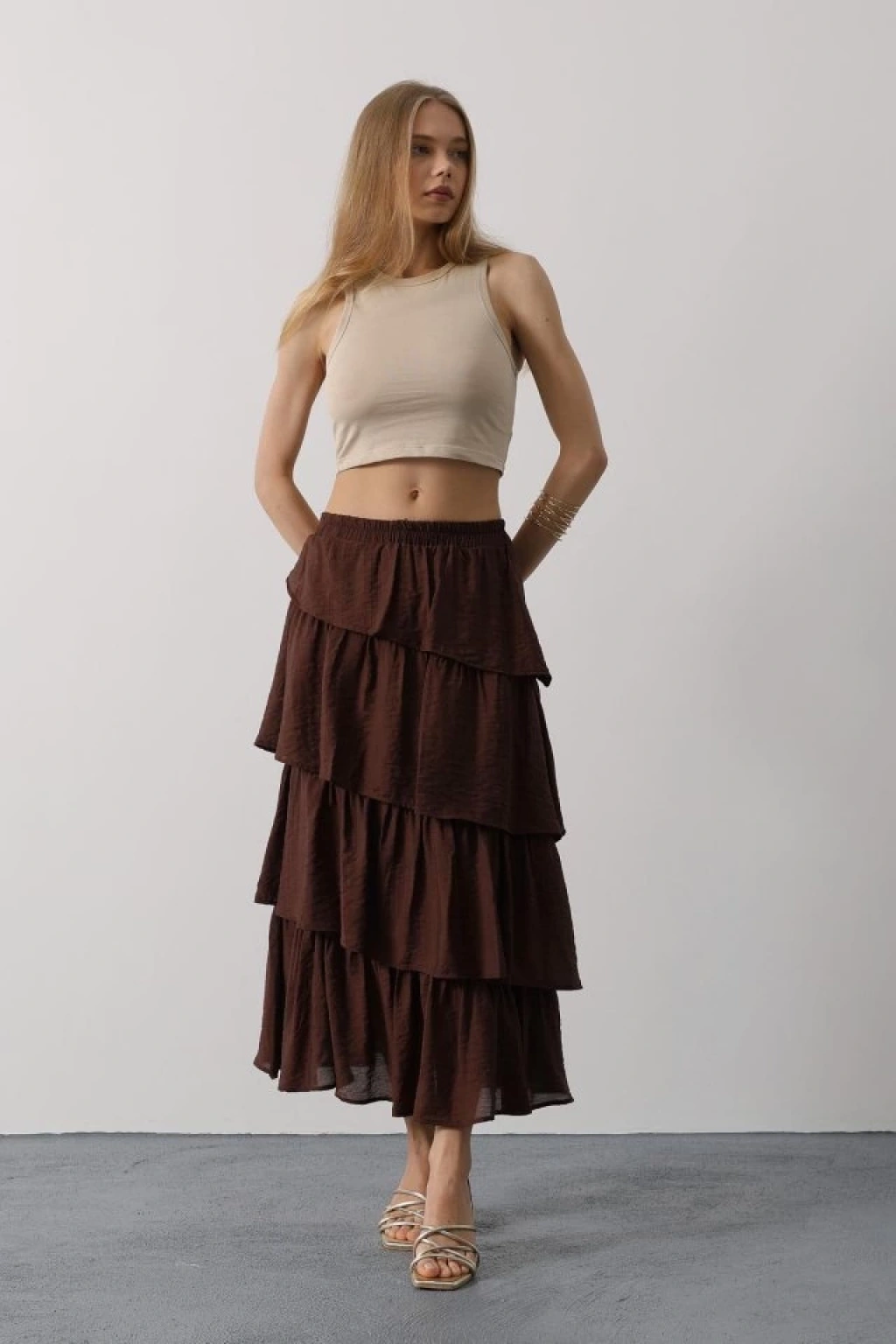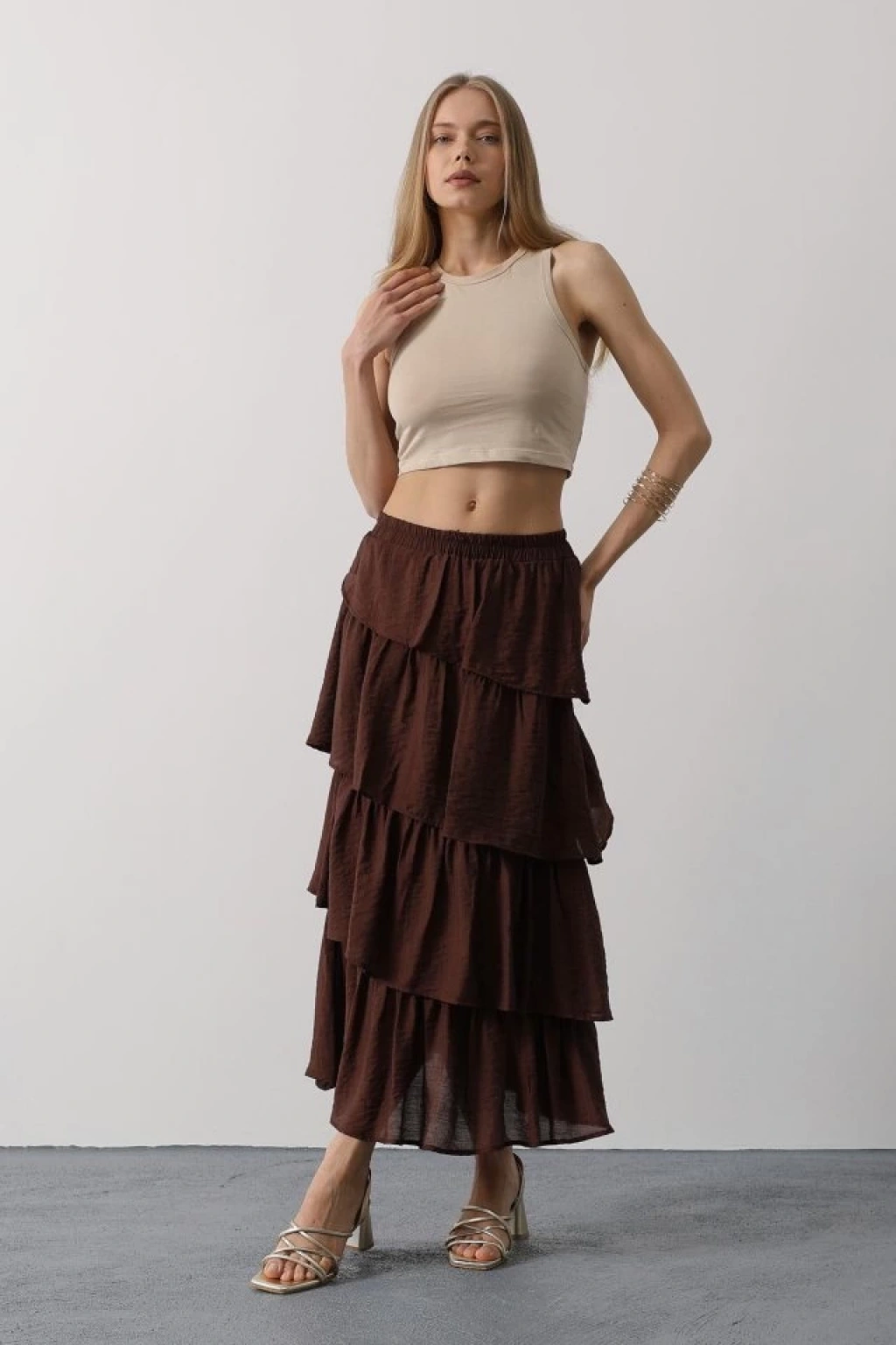 Katlı Kesim Uzun Etek - Kahve